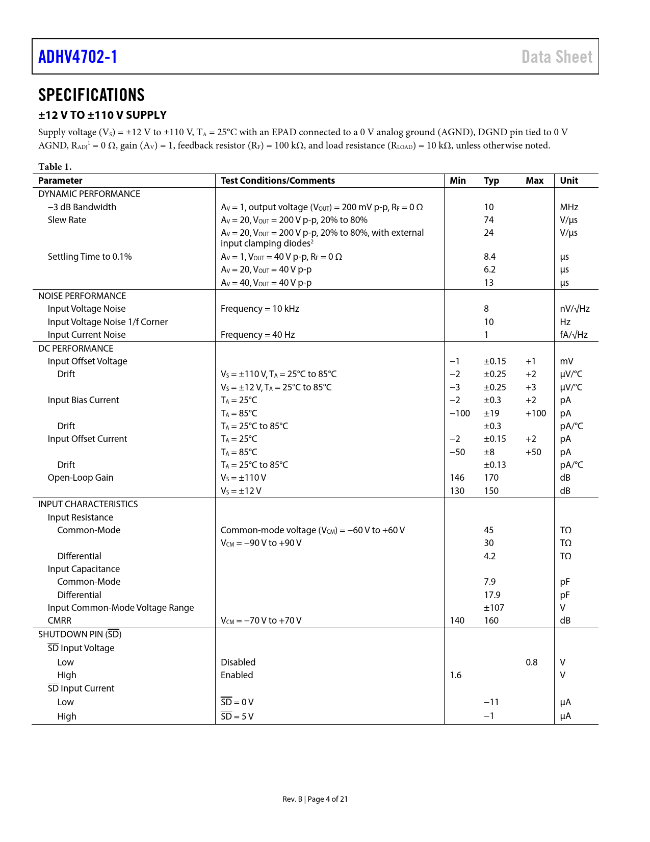 link to page 5 link to page 5 ADHV4702-1Data SheetSPECIFICATIONS ±12 V TO ±110 V SUPPLY Supply voltage (VS) = ±12 V to ±110 V, TA = 25°C with an EPAD connected to a 0 V analog ground (AGND), DGND pin tied to 0 V AGND, R 1 ADJ = 0 Ω, gain (AV) = 1, feedback resistor (RF) = 100 kΩ, and load resistance (RLOAD) = 10 kΩ, unless otherwise noted. Table 1. Parameter TestConditions/CommentsMinTypMaxUnit DYNAMIC PERFORMANCE −3 dB Bandwidth AV = 1, output voltage (VOUT) = 200 mV p-p, RF = 0 Ω 10 MHz Slew Rate AV = 20, VOUT = 200 V p-p, 20% to 80% 74 V/μs AV = 20, VOUT = 200 V p-p, 20% to 80%, with external 24 V/μs input clamping diodes2 Settling Time to 0.1% AV = 1, VOUT = 40 V p-p, RF = 0 Ω 8.4 μs AV = 20, VOUT = 40 V p-p 6.2 μs AV = 40, VOUT = 40 V p-p 13 μs NOISE PERFORMANCE Input Voltage Noise Frequency = 10 kHz 8 nV/√Hz Input Voltage Noise 1/f Corner 10 Hz Input Current Noise Frequency = 40 Hz 1 fA/√Hz DC PERFORMANCE Input Offset Voltage −1 ±0.15 +1 mV Drift VS = ±110 V, TA = 25°C to 85°C −2 ±0.25 +2 μV/°C VS = ±12 V, TA = 25°C to 85°C −3 ±0.25 +3 μV/°C Input Bias Current TA = 25°C −2 ±0.3 +2 pA TA = 85°C −100 ±19 +100 pA Drift TA = 25°C to 85°C ±0.3 pA/°C Input Offset Current TA = 25°C −2 ±0.15 +2 pA TA = 85°C −50 ±8 +50 pA Drift TA = 25°C to 85°C ±0.13 pA/°C Open-Loop Gain VS = ±110 V 146 170 dB VS = ±12 V 130 150 dB INPUT CHARACTERISTICS Input Resistance Common-Mode Common-mode voltage (VCM) = −60 V to +60 V 45 TΩ VCM = −90 V to +90 V 30 TΩ Differential 4.2 TΩ Input Capacitance Common-Mode 7.9 pF Differential 17.9 pF Input Common-Mode Voltage Range ±107 V CMRR VCM = −70 V to +70 V 140 160 dB SHUTDOWN PIN (SD) SD Input Voltage Low Disabled 0.8 V High Enabled 1.6 V SD Input Current Low SD = 0 V −11 μA High SD = 5 V −1 μA Rev. B | Page 4 of 21 Document Outline FEATURES APPLICATIONS GENERAL DESCRIPTION TYPICAL APPLICATION CIRCUIT TABLE OF CONTENTS REVISION HISTORY FUNCTIONAL BLOCK DIAGRAM SPECIFICATIONS ±12 V TO ±110 V SUPPLY ABSOLUTE MAXIMUM RATINGS MAXIMUM POWER DISSIPATION THERMAL RESISTANCE ESD CAUTION PIN CONFIGURATION AND FUNCTION DESCRIPTIONS TYPICAL PERFORMANCE CHARACTERISTICS THEORY OF OPERATION INTERNAL ELECTROSTATIC DISCHARGE (ESD) PROTECTION SLEW BOOST CIRCUIT AND PROTECTION DIGITAL GROUND (DGND) RESISTOR ADJUSTABLE QUIESCENT CURRENT (RADJ) SHUTDOWN PIN (SDB) TEMPERATURE MONITOR (TMP) OVERTEMPERATURE PROTECTION OUTPUT CURRENT DRIVE AND SHORT-CIRCUIT PROTECTION EXTERNAL COMPENSATION AND CAPACITIVE LOAD (CLOAD) DRIVING SAFE OPERATING AREA LFCSP PACKAGE AND HIGH VOLTAGE PIN SPACING EXPOSED PAD (EPAD) APPLICATIONS INFORMATION POWER SUPPLY AND DECOUPLING HIGH VOLTAGE GUARD RING HIGH VOLTAGE DAC VOLTAGE SUBTRACTOR HIGH CURRENT OUTPUT DRIVER SIGNAL RANGE EXTENDER OUTLINE DIMENSIONS ORDERING GUIDE
