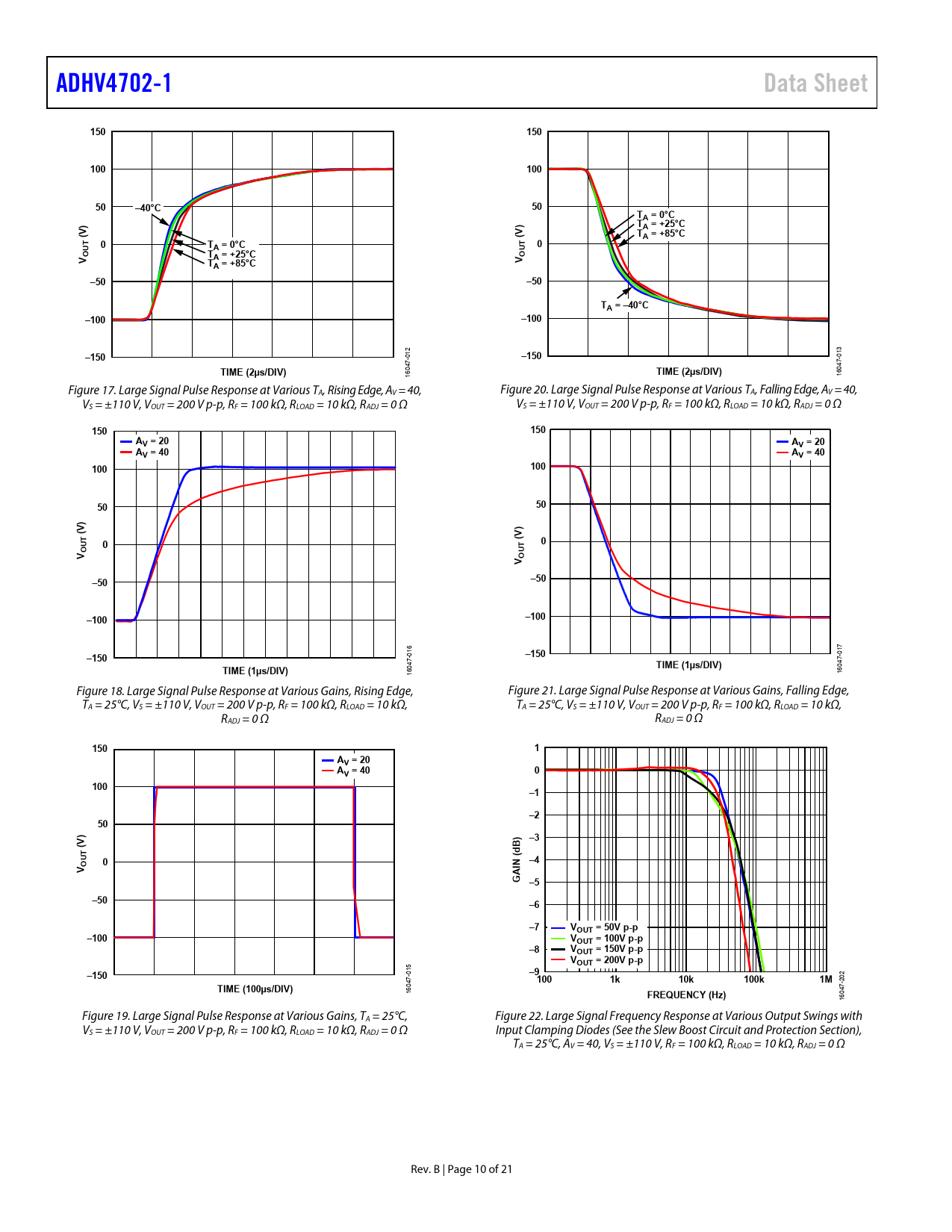 link to page 15 ADHV4702-1Data Sheet15015010010050–40°C50TA = 0°C))TVVA = +25°C((TA = +85°CT0TTA = 0°C0OUTOUVA = +25°CTVA = +85°C–50–50TA = –40°C–100–100–150 012 –150 013 7- TIME (2µs/DIV) 047- TIME (2µs/DIV) 16 1604 Figure 17. Large Signal Pulse Response at Various TA, Rising Edge, AV = 40, Figure 20. Large Signal Pulse Response at Various TA, Falling Edge, AV = 40, VS = ±110 V, VOUT = 200 V p-p, RF = 100 kΩ, RLOAD = 10 kΩ, RADJ = 0 Ω VS = ±110 V, VOUT = 200 V p-p, RF = 100 kΩ, RLOAD = 10 kΩ, RADJ = 0 Ω 150150AV = 20AV = 20AV = 40AV = 401001005050) (V) VT(0T0OUVOUV–50–50–100–100 017 –150 016 –150TIME (1µs/DIV) 47- TIME (1µs/DIV) 16047- 160 Figure 18. Large Signal Pulse Response at Various Gains, Rising Edge, Figure 21. Large Signal Pulse Response at Various Gains, Falling Edge, TA = 25°C, VS = ±110 V, VOUT = 200 V p-p, RF = 100 kΩ, RLOAD = 10 kΩ, TA = 25°C, VS = ±110 V, VOUT = 200 V p-p, RF = 100 kΩ, RLOAD = 10 kΩ, RADJ = 0 Ω RADJ = 0 Ω 1501AV = 20AV = 400100–1–250) V) –3( TdBU(O0–4VIN GA –5–50–6–7VOUT = 50V p-p–100VOUT = 100V p-p–8VOUT = 150V p-pV 5 OUT = 200V p-p–150 01 –9 2 47- 1001k10k100k1M 20 TIME (100µs/DIV) 7- 160 FREQUENCY (Hz) 1604 Figure 19. Large Signal Pulse Response at Various Gains, TA = 25°C, Figure 22. Large Signal Frequency Response at Various Output Swings with VS = ±110 V, VOUT = 200 V p-p, RF = 100 kΩ, RLOAD = 10 kΩ, RADJ = 0 Ω Input Clamping Diodes (See the Slew Boost Circuit and Protection Section), TA = 25°C, AV = 40, VS = ±110 V, RF = 100 kΩ, RLOAD = 10 kΩ, RADJ = 0 Ω Rev. B | Page 10 of 21 Document Outline FEATURES APPLICATIONS GENERAL DESCRIPTION TYPICAL APPLICATION CIRCUIT TABLE OF CONTENTS REVISION HISTORY FUNCTIONAL BLOCK DIAGRAM SPECIFICATIONS ±12 V TO ±110 V SUPPLY ABSOLUTE MAXIMUM RATINGS MAXIMUM POWER DISSIPATION THERMAL RESISTANCE ESD CAUTION PIN CONFIGURATION AND FUNCTION DESCRIPTIONS TYPICAL PERFORMANCE CHARACTERISTICS THEORY OF OPERATION INTERNAL ELECTROSTATIC DISCHARGE (ESD) PROTECTION SLEW BOOST CIRCUIT AND PROTECTION DIGITAL GROUND (DGND) RESISTOR ADJUSTABLE QUIESCENT CURRENT (RADJ) SHUTDOWN PIN (SDB) TEMPERATURE MONITOR (TMP) OVERTEMPERATURE PROTECTION OUTPUT CURRENT DRIVE AND SHORT-CIRCUIT PROTECTION EXTERNAL COMPENSATION AND CAPACITIVE LOAD (CLOAD) DRIVING SAFE OPERATING AREA LFCSP PACKAGE AND HIGH VOLTAGE PIN SPACING EXPOSED PAD (EPAD) APPLICATIONS INFORMATION POWER SUPPLY AND DECOUPLING HIGH VOLTAGE GUARD RING HIGH VOLTAGE DAC VOLTAGE SUBTRACTOR HIGH CURRENT OUTPUT DRIVER SIGNAL RANGE EXTENDER OUTLINE DIMENSIONS ORDERING GUIDE
