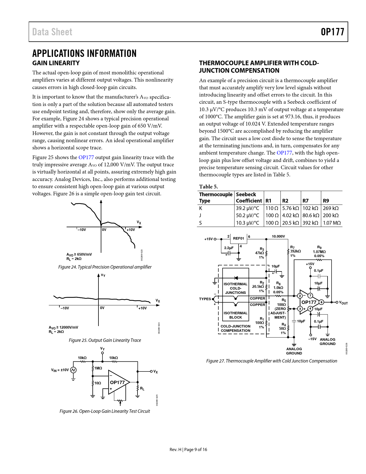 Data Sheet. OP177. APPLICATIONS INFORMATION GAIN LINEARITY. THERMOCOUPLE AMPLIFIER WITH COLD-. JUNCTION COMPENSATION. Table 5