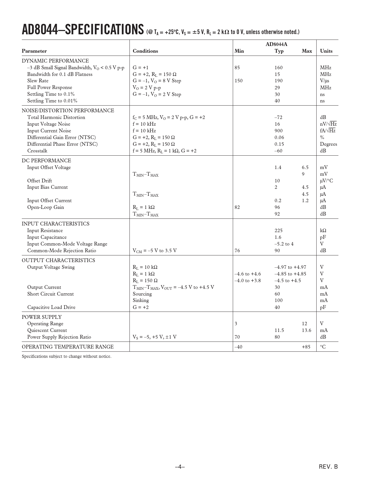 AD8044–SPECIFICATIONS (@ TA = +25 C, VS = 5 V, RL = 2 k to 0 V, unless otherwise noted.) AD8044A Parameter Conditions Min Typ