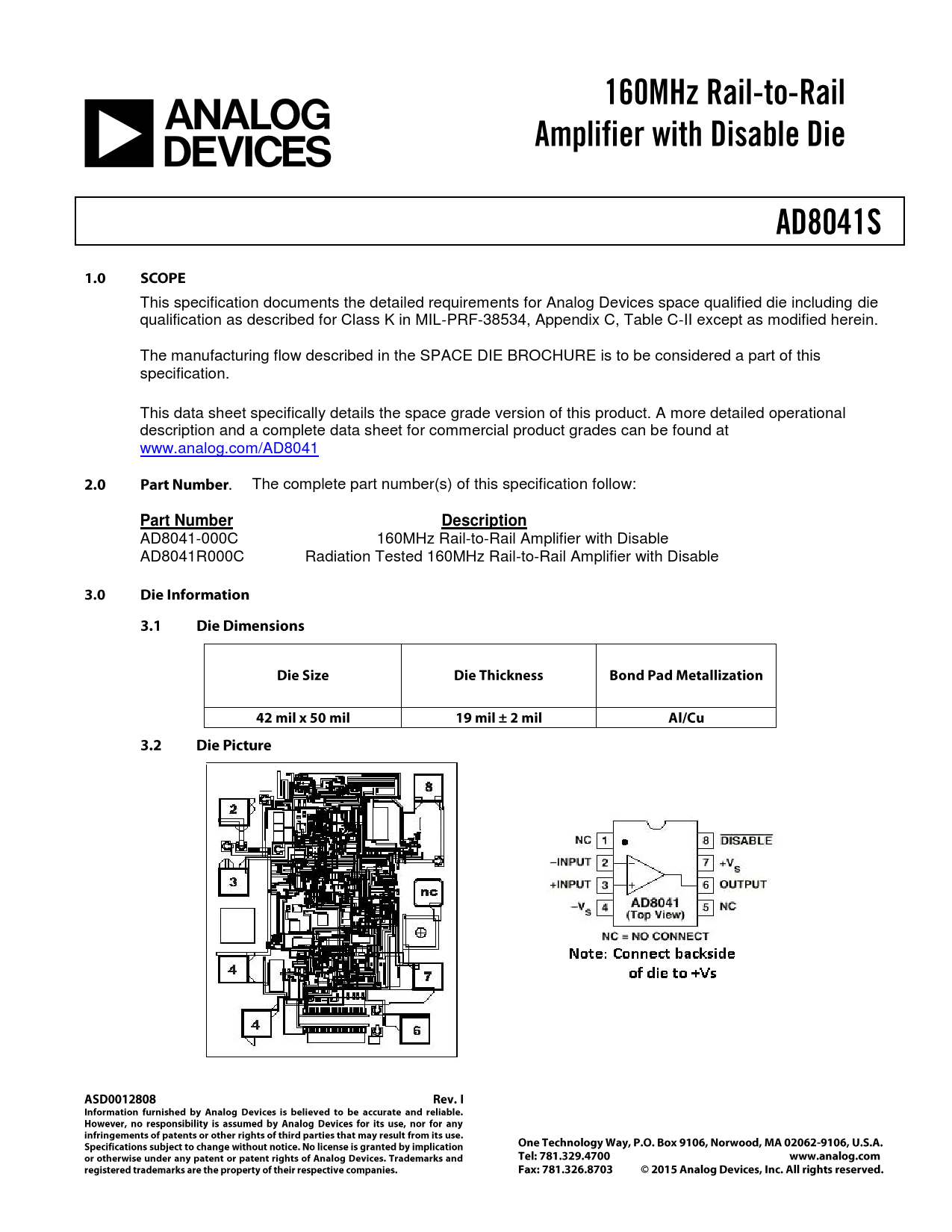 This specification documents the detailed requirements for Analog Devices space qualified die including die qualification as described for Class K in MIL-PRF-38534, Appendix C, Table C-II except as modified herein. The manufacturing flow described in the SPACE DIE BROCHURE is to be considered a part of this specification. This data sheet specifically details the space grade version of this product. A more detailed operational description and a complete data sheet for commercial product grades can be found at www.analog.com/AD8041 The complete part number(s) of this specification follow: Part NumberDescription AD8041-000C 160MHz Rail-to-Rail Amplifier with Disable AD8041R000C Radiation Tested 160MHz Rail-to-Rail Amplifier with Disable