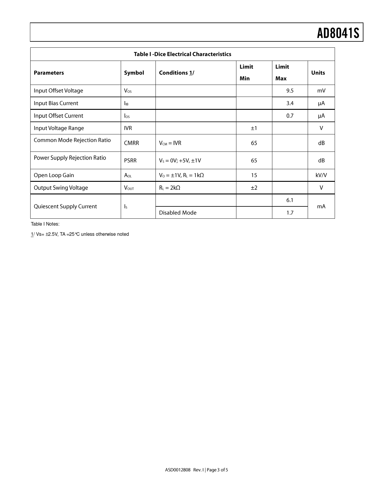 Table I Notes: 1/ Vs= ±2.5V, TA =25°C unless otherwise noted