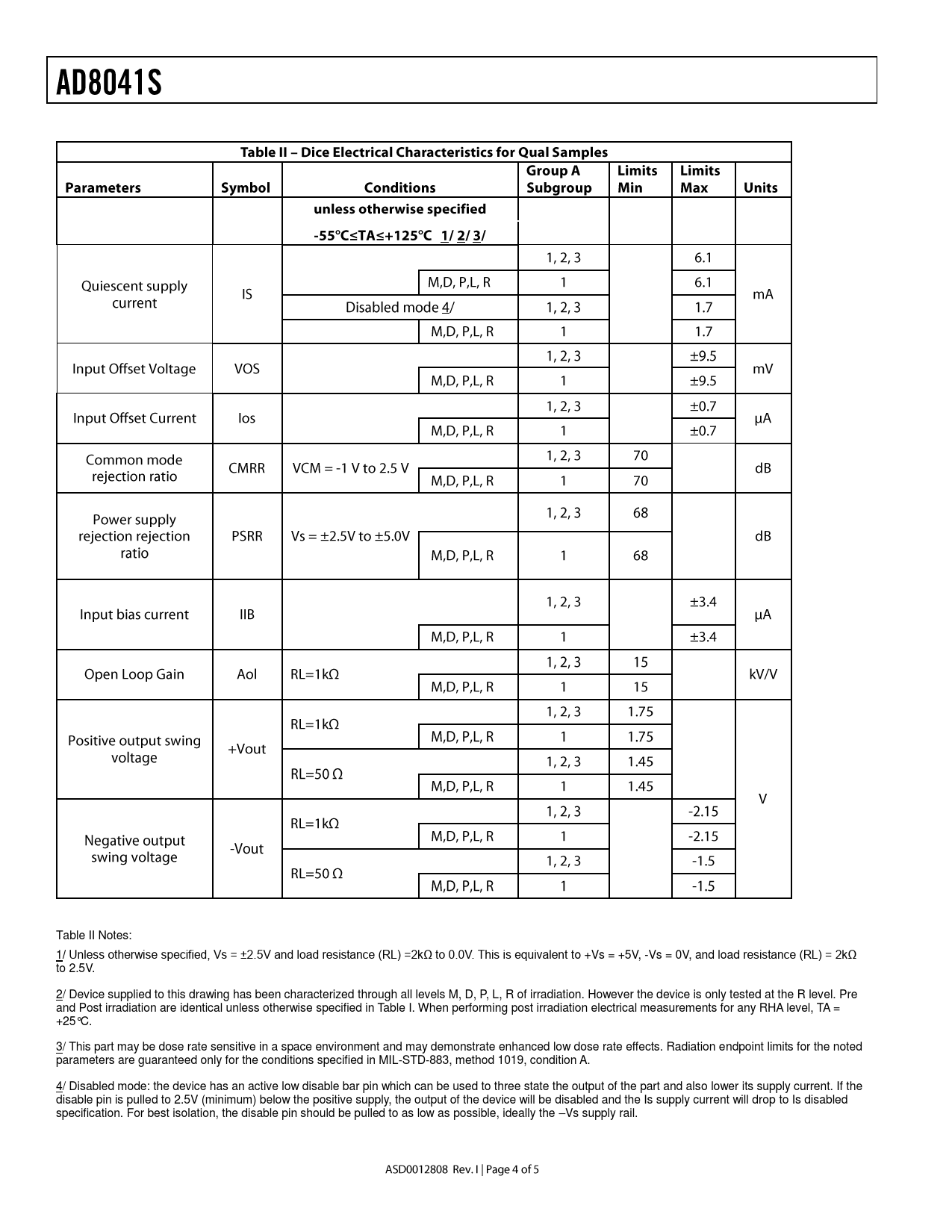 Table II Notes: 1/ Unless otherwise specified, Vs = ±2.5V and load resistance (RL) =2kΩ to 0.0V. This is equivalent to +Vs = +5V, -Vs = 0V, and load resistance (RL) = 2kΩ to 2.5V. 2/ Device supplied to this drawing has been characterized through all levels M, D, P, L, R of irradiation. However the device is only tested at the R level. Pre and Post irradiation are identical unless otherwise specified in Table I. When performing post irradiation electrical measurements for any RHA level, TA = +25°C. 3/ This part may be dose rate sensitive in a space environment and may demonstrate enhanced low dose rate effects. Radiation endpoint limits for the noted parameters are guaranteed only for the conditions specified in MIL-STD-883, method 1019, condition A. 4/ Disabled mode: the device has an active low disable bar pin which can be used to three state the output of the part and also lower its supply current. If the disable pin is pulled to 2.5V (minimum) below the positive supply, the output of the device will be disabled and the Is supply current will drop to Is disabled specification. For best isolation, the disable pin should be pulled to as low as possible, ideally the –Vs supply rail.