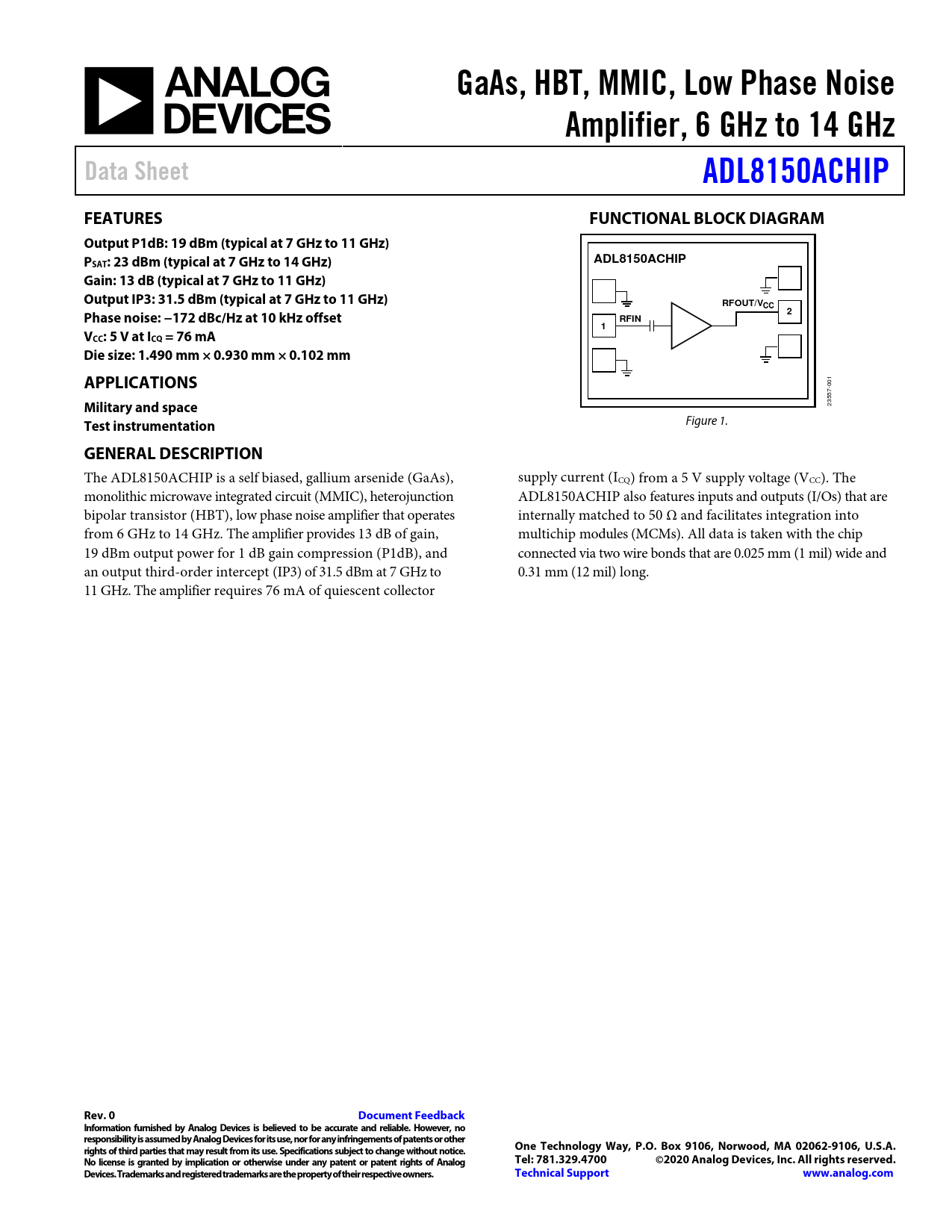 GaAs, HBT, MMIC, Low Phase Noise. Amplifier, 6 GHz to 14 GHz. Data Sheet. ADL8150ACHIP. FEATURES. FUNCTIONAL BLOCK DIAGRAM