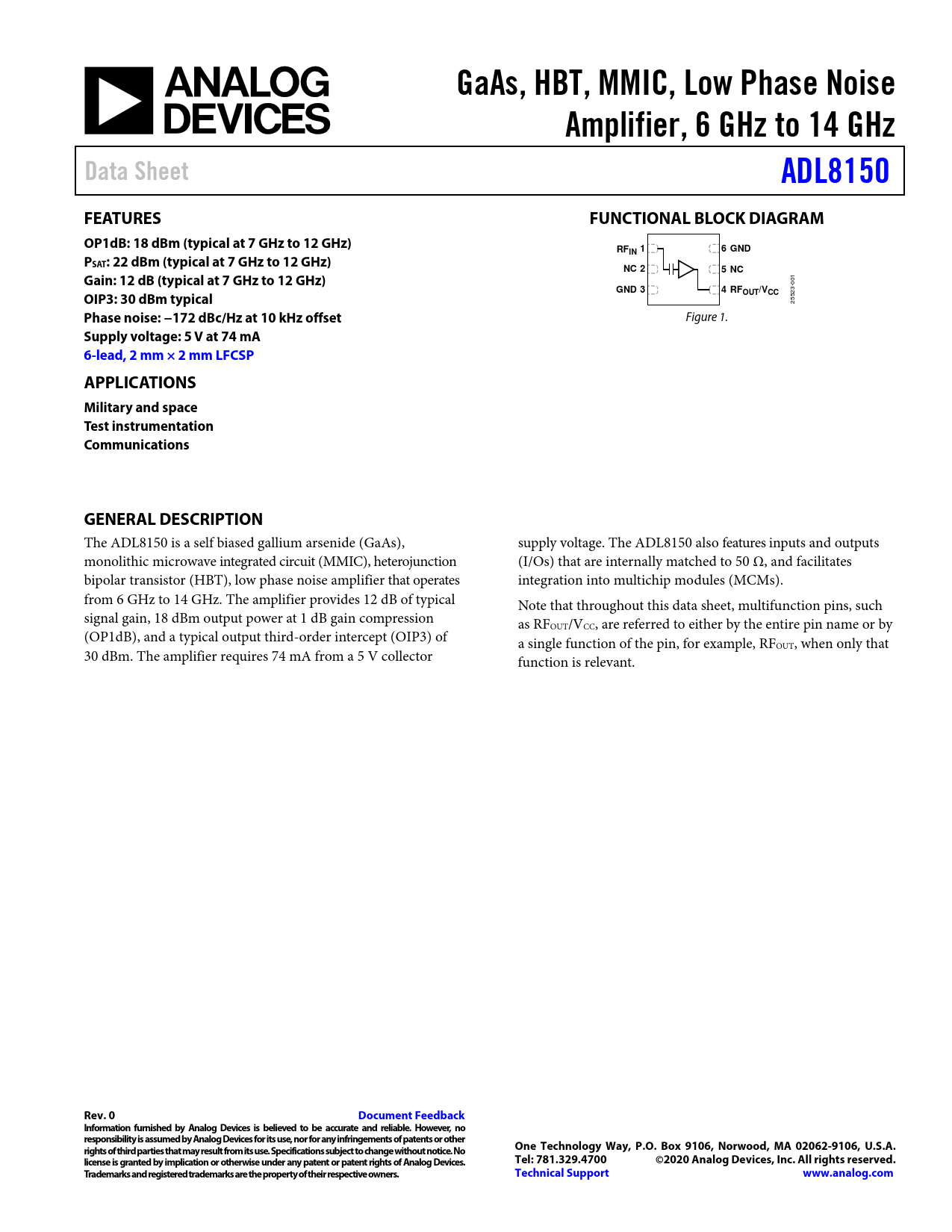 GaAs, HBT, MMIC, Low Phase Noise. Amplifier, 6 GHz to 14 GHz. Data Sheet. ADL8150. FEATURES. FUNCTIONAL BLOCK DIAGRAM