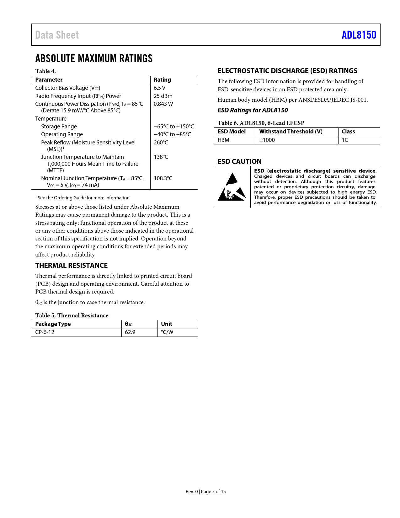 Data Sheet. ADL8150. ABSOLUTE MAXIMUM RATINGS Table 4. ELECTROSTATIC DISCHARGE (ESD) RATINGS. Parameter. Rating