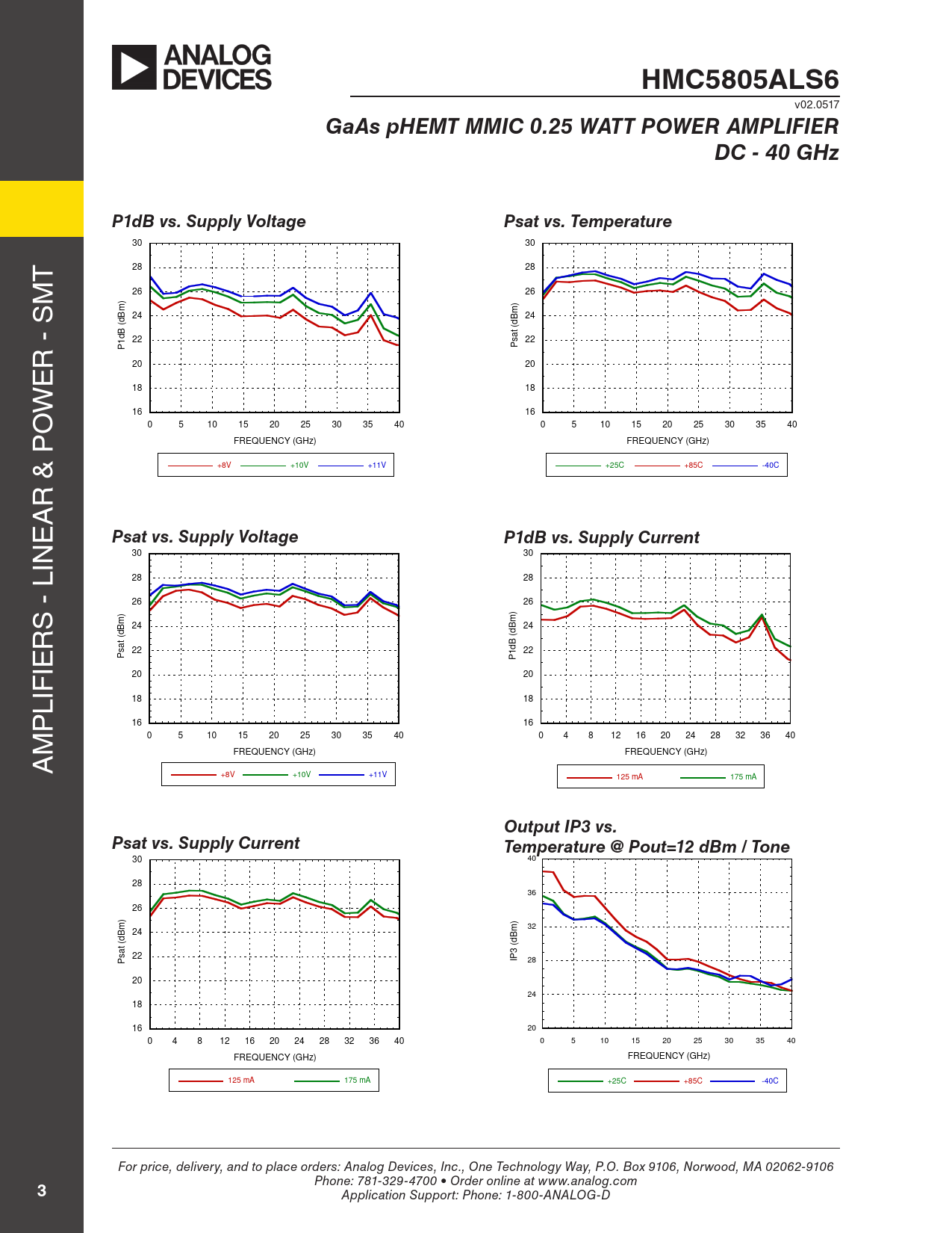 30 40 28 36 26 ) m 32 24 m (dB (dB at 3 s 22 P IP 28 20 24 18 16 20 0 4 8 12 16 20 24 28 32 36 40 0 5 10 15 20 25 30 35 40 FREQUENCY (GHz) FREQUENCY (GHz) 125 mA 175 mA +25C +85C -40C For price, delivery, and to place orders: Analog Devices, Inc., One Technology Way, P.O. Box 9106, Norwood, MA 02062-9106 Phone: 781-329-4700 • Order online at www.analog.com