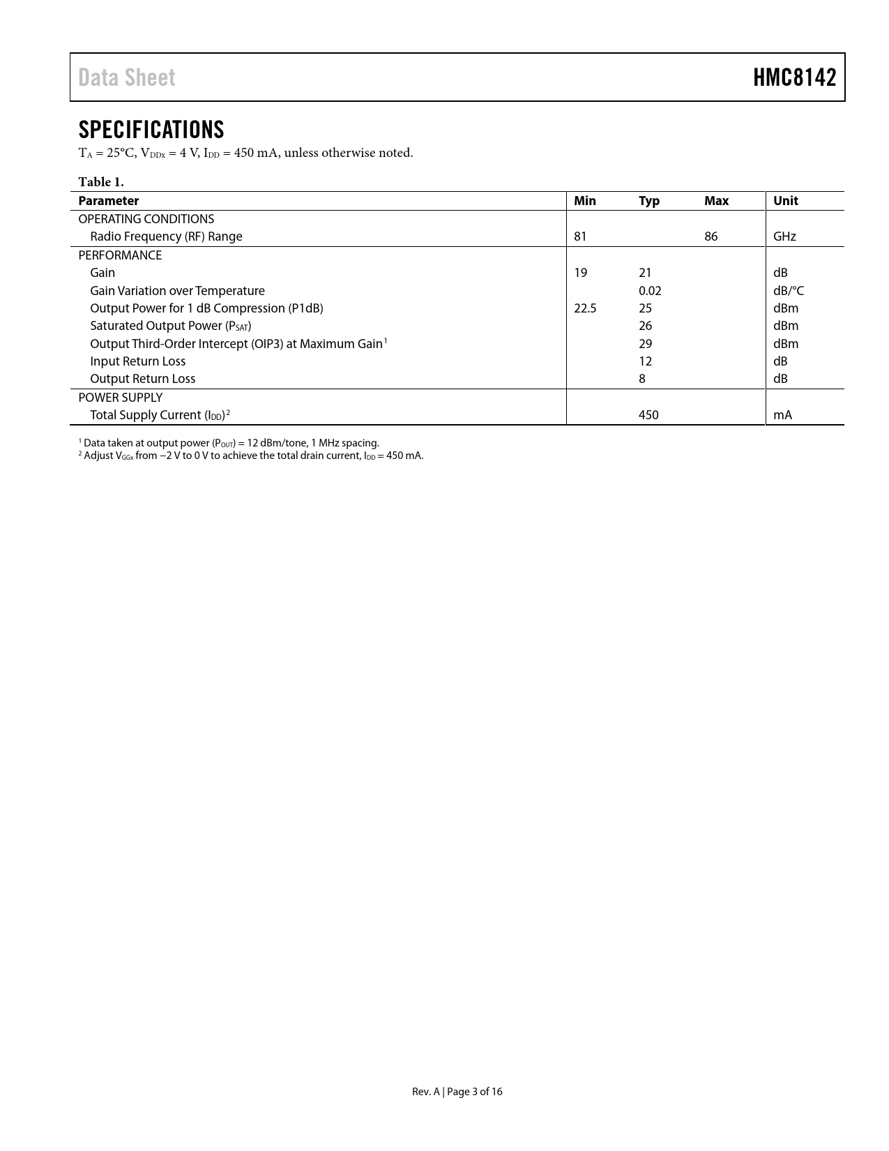 Data Sheet HMC8142 SPECIFICATIONS Table 1 Parameter Min Typ Max Unit