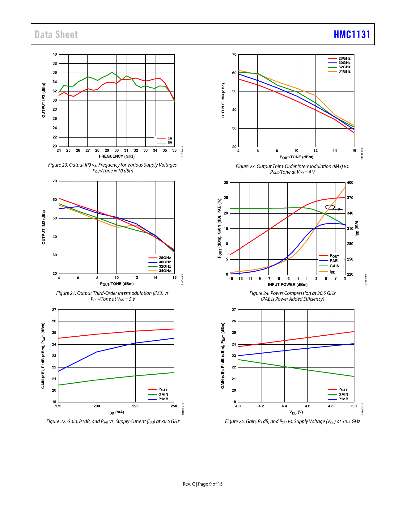 Data Sheet. HMC1131. 28GHz. 30GHz 32GHz. 34GHz. Bm). Bc). 3 (. 4V 5V. FREQUENCY (GHz). POUT/TONE (dBm). 400. 370. %) ( AE. 340. , P. M I. N ( 15. 310. mA)