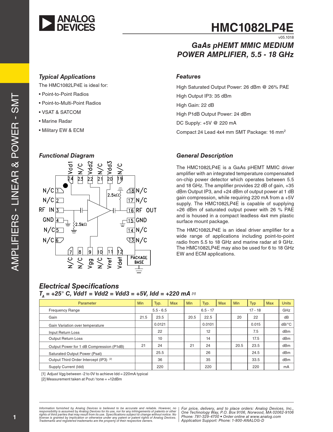 HMC1082LP4E v05.1018 GaAs pHEMT MMIC MEDIUMPOWER AMPLIFIER, 5.5 - 18 GHzTypical ApplicationsFeatures The HMC1082LP4E is ideal for: High Saturated Output Power: 26 dBm @ 26% PAE T • Point-to-Point Radios High Output IP3: 35 dBm M • Point-to-Multi-Point Radios High Gain: 22 dB • VSAT & SATCOM High P1dB Output Power: 24 dBm R - S • Marine Radar DC Supply: +5V @ 220 mA E • Military EW & ECM Compact 24 Lead 4x4 mm SMT Package: 16 mm2 W O Functional DiagramGeneral Description The HMC1082LP4E is a GaAs pHEMT MMIC driver R & P amplifier with an integrated temperature compensated A on-chip power detector which operates between 5.5 E and 18 GHz. The amplifier provides 22 dB of gain, +35 IN dBm Output IP3, and +24 dBm of output power at 1 dB gain compression, while requiring 220 mA from a +5V supply. The HMC1082LP4E is capable of supplying +26 dBm of saturated output power with 26 % PAE S - L and is housed in a compact leadless 4x4 mm plastic R surface mount package. IE The HMC1082LP4E is an ideal driver amplifier for a wide range of applications including point-to-point LIF radio from 5.5 to 18 GHz and marine radar at 9 GHz. P The HMC1082LP4E may also be used for 6 to 18 GHz EW and ECM applications. M A Electrical SpecificationsT = +25° C, Vdd1 = Vdd2 = Vdd3 = +5V, Idd = +220 mA [1]A Parameter Min Typ. Max Min Typ. Max Min Typ Max Units Frequency Range 5.5 - 6.5 6.5 - 17 17 - 18 GHz Gain 21.5 23.5 20.5 22.5 20 22 dB Gain Variation over temperature 0.0121 0.0101 0.015 dB/°C Input Return Loss 22 12 7.5 dBm Output Return Loss 10 14 17.5 dBm Output Power for 1 dB Compression (P1dB) 21 24 21 24 20.5 23.5 dBm Saturated Output Power (Psat) 25.5 26 24.5 dBm Output Third Order Intercept (IP3) [2] 36 35 33.5 dBm Supply Current (Idd) 220 220 220 mA [1] Adjust Vgg between -2 to 0V to achieve Idd = 220mA typical [2] Measurement taken at Pout / tone = +12dBm Information furnished by Analog Devices is believed to be accurate and reliable. However, no For price, delivery, and to place orders: Analog Devices, Inc., responsibility is assumed by Analog Devices for its use, nor for any infringements of patents or other One Technology Way, P.O. Box 9106, Norwood, MA 02062-9106 1 rights of third parties that may result from its use. Specifications subject to change without notice. No Phone: 781-329-4700 • Order online at www.analog.com license is granted by implication or otherwise under any patent or patent rights of Analog Devices. Trademarks and registered trademarks are the property of their respective owners. Application Support: Phone: 1-800-ANALOG-D