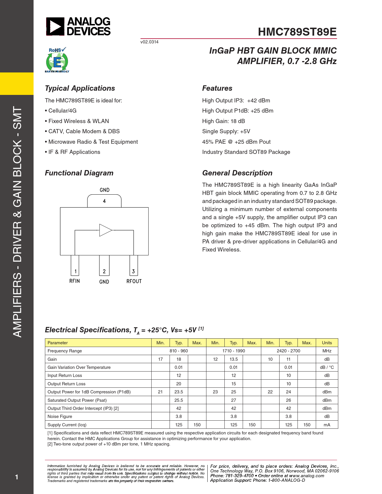 HMC789ST89E v02.0314 InGaP HBT GAIN BLOCK MMICAMPLIFIER, 0.7 -2.8 GHzTypical ApplicationsFeatures The HMC789ST89E is ideal for: High Output IP3: +42 dBm T • Cel ular/4G High Output P1dB: +25 dBm M • Fixed Wireless & WLAN High Gain: 18 dB • CATV, Cable Modem & DBS Single Supply: +5V K - S • Microwave Radio & Test Equipment 45% PAE @ +25 dBm Pout C • IF & RF Applications Industry Standard SOT89 Package LO Functional DiagramGeneral Description IN B The HMC789ST89E is a high linearity GaAs InGaP A HBT gain block MMIC operating from 0.7 to 2.8 GHz and packaged in an industry standard SOT89 package. Utilizing a minimum number of external components and a single +5V supply, the amplifier output IP3 can R & G be optimized to +45 dBm. The high output IP3 and E high gain make the HMC789ST89E ideal for use in IV PA driver & pre-driver applications in Cel ular/4G and R Fixed Wireless. S - D R IE LIF P M A Electrical Specifications, T = +25°C, Vs= +5V [1]A Parameter Min. Typ. Max. Min. Typ. Max. Min. Typ. Max. Units Frequency Range 810 - 960 1710 - 1990 2420 - 2700 MHz Gain 17 18 12 13.5 10 11 dB Gain Variation Over Temperature 0.01 0.01 0.01 dB / °C Input Return Loss 12 12 10 dB Output Return Loss 20 15 10 dB Output Power for 1dB Compression (P1dB) 21 23.5 23 25 22 24 dBm Saturated Output Power (Psat) 25.5 27 26 dBm Output Third Order Intercept (IP3) [2] 42 42 42 dBm Noise Figure 3.8 3.8 3.8 dB Supply Current (Icq) 125 150 125 150 125 150 mA [1] Specifications and data reflect HMC789ST89E measured using the respective application circuits for each designated frequency band found herein. Contact the HMC Applications Group for assistance in optimizing performance for your application. [2] Two-tone output power of +10 dBm per tone, 1 MHz spacing. I F nf o or r p mati r o in cfe ur , d nish e e l d iv b e y r A y a nalo n g d t Devi o p ces i la s c bele o ieve rd d t e o rbs e : H acc iutrtatite e M and ic reli rao bl w e. a H v o e C wever o , nrp o For price, delivery, and to place orders: Analog Devices, Inc., responsibility is assumed by Analog Devices for its use, nor for any infringements of patents or other oration, 2 Elizabeth Drive, Chelmsford, MA 01824 One Technology Way, P.O. Box 9106, Norwood, MA 02062-9106 Phone: 978-250-3343 Fax: 978-250-3373 O rights of third parties that may result from its use. Specifications subject to change without notice. No rd Phoe n r O e: 7 n- 81-li 3 n 2 e a 9-4 t w 70 ww 0 • O . rdh e itt r o it nle i . n co e a m 1 license is granted by implication or otherwise under any patent or patent rights of Analog Devices. t www.analog.com Application Support: Phon Trademarks and registered trademarks are the property of their respective owners. e: 978-250-334 A 3 o pplic r a atio pp n S s u @ p h por ittti : Pte ho.c n o e m : 1-800-ANALOG-D