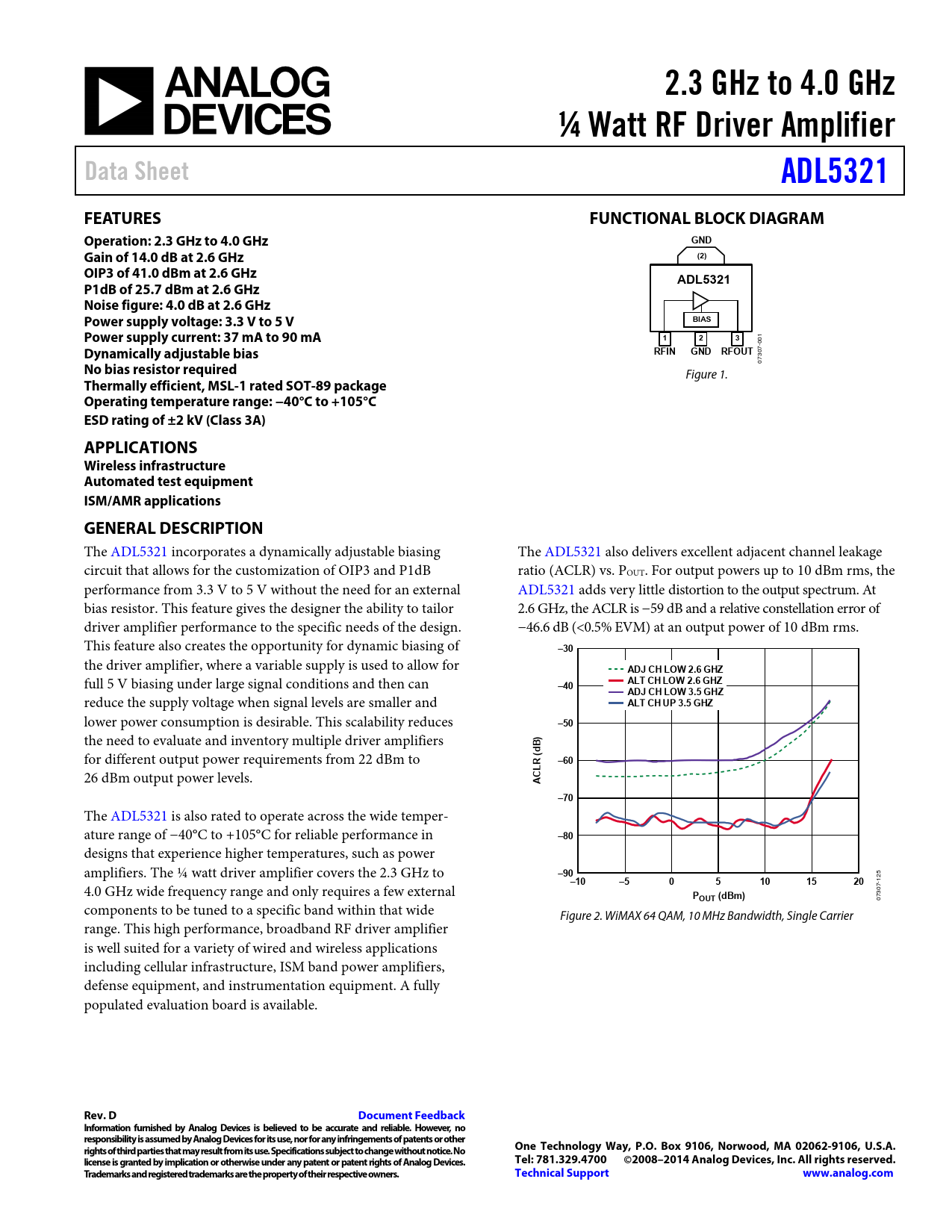 2.3 GHz to 4.0 GHz. ¼ Watt RF Driver Amplifier. Data Sheet. ADL5321. FEATURES. FUNCTIONAL BLOCK DIAGRAM