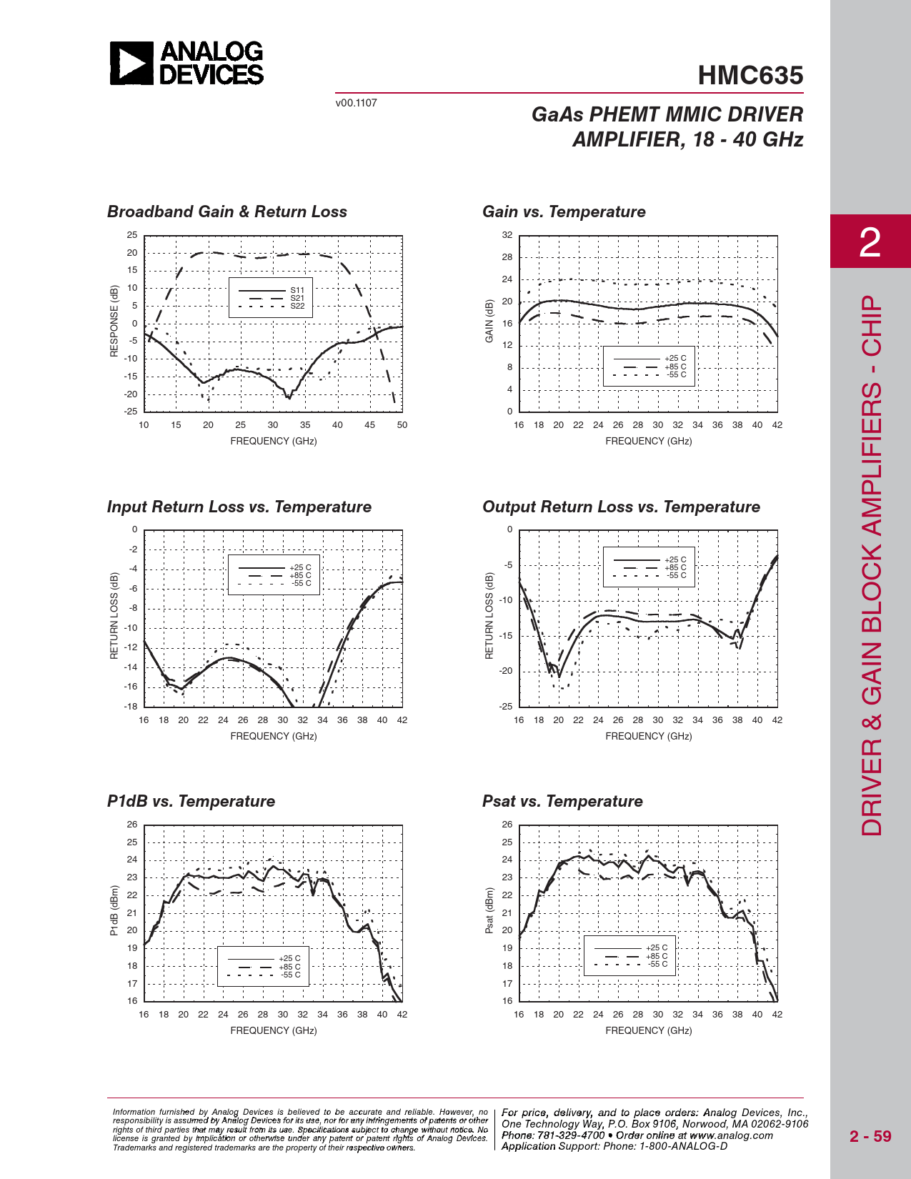 HMC635 v00.1107 GaAs PHEMT MMIC DRIVERAMPLIFIER, 18 - 40 GHzBroadband Gain & Return LossGain vs. Temperature 25 32 20 28 2 15 24 10 S11 S21 5 20 S22 (dB) IP 0 16 H -5 GAIN 12 RESPONSE (dB) -10 +25 C 8 +85 C -15 -55 C - C -20 4 S -25 0 R 10 15 20 25 30 35 40 45 50 16 18 20 22 24 26 28 30 32 34 36 38 40 42 FREQUENCY (GHz) FREQUENCY (GHz) IE IF L P Input Return Loss vs. TemperatureOutput Return Loss vs. Temperature M 0 0 -2 +25 C K A -4 +25 C -5 +85 C +85 C -55 C -6 -55 C -10 OC -8 -10 -15 BL -12 RETURN LOSS (dB) RETURN LOSS (dB) -14 IN -20 A -16 -18 -25 16 18 20 22 24 26 28 30 32 34 36 38 40 42 16 18 20 22 24 26 28 30 32 34 36 38 40 42 FREQUENCY (GHz) FREQUENCY (GHz) & G R E IV P1dB vs. TemperaturePsat vs. Temperature R 26 26 D 25 25 24 24 23 23 22 22 21 21 20 P1dB (dBm) Psat (dBm) 20 19 19 +25 C +25 C +85 C 18 +85 C 18 -55 C -55 C 17 17 16 16 16 18 20 22 24 26 28 30 32 34 36 38 40 42 16 18 20 22 24 26 28 30 32 34 36 38 40 42 FREQUENCY (GHz) FREQUENCY (GHz) Information furnis F heod r pri by An ce, de alog Devi lcievs eir s y b , a eliev nd to pla ed to be accu ce o rate anrder d relia sbl, pl e. H ease co owever, no For price, delivery, and to place orders: Analog Devices, Inc., responsibility is assumed by Analog Devices for its use, nor for any infringements of patents or other ntact Hittite Microwave Corporation: One Technology Way, P.O. Box 9106, Norwood, MA 02062-9106 20 Alpha Road, Chelmsford, MA 01824 Phone: 978 rights of third parties that may result from its use. Specifications subject to change without notice. No Pho - n25 e 0 : 7 - 81 3 - 3 32 4 9-3 F 470 ax: 978 0 • Orde - r o 25 nlin 0- e a 3 t 373 license is granted by implication or otherwise under any patent or patent rights of Analog Devices. www.analog.com 2 - 59 Order On-l Trademarks and registered trademarks are the property of their respective owners. ine at www.hit A ti p te.co plicati m on Support: Phone: 1-800-ANALOG-D