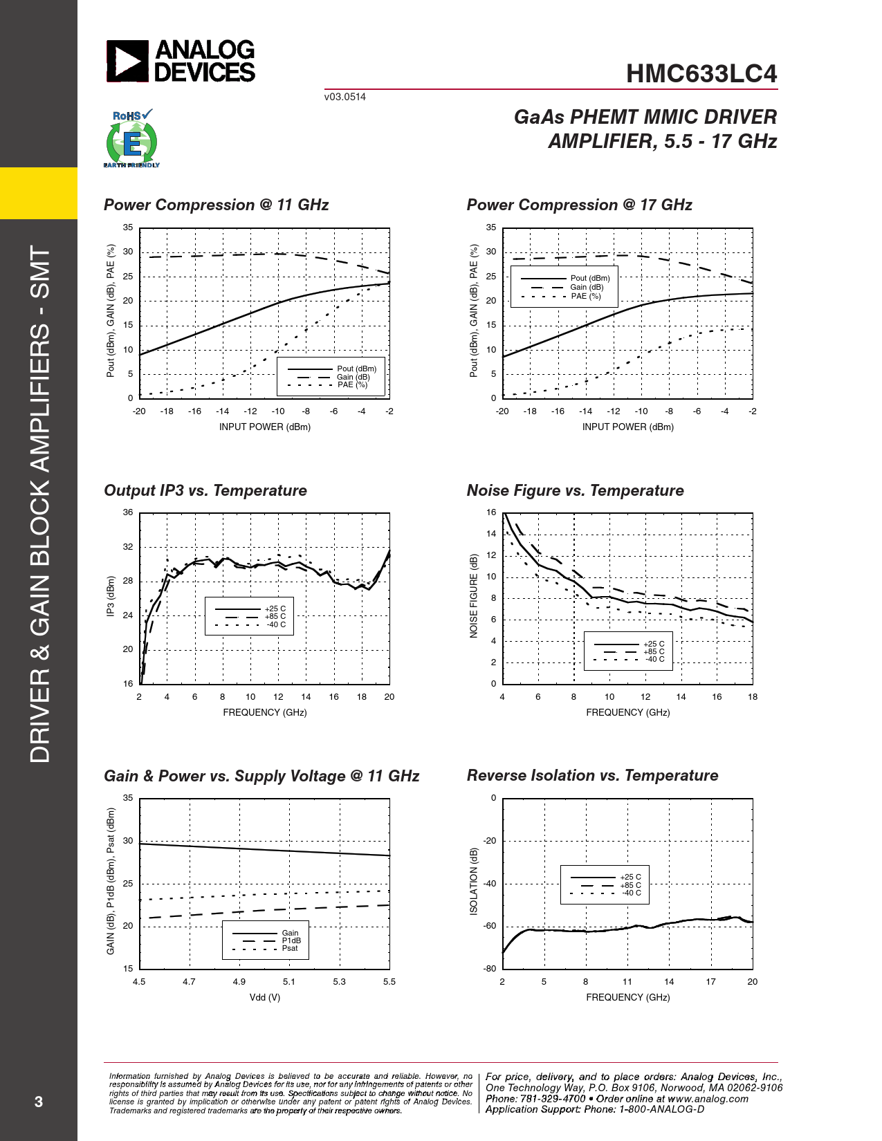 HMC633LC4. GaAs PHEMT MMIC DRIVER. AMPLIFIER, 5.5 - 17 GHz. Power Compression @ 11 GHz. Power Compression @ 17 GHz