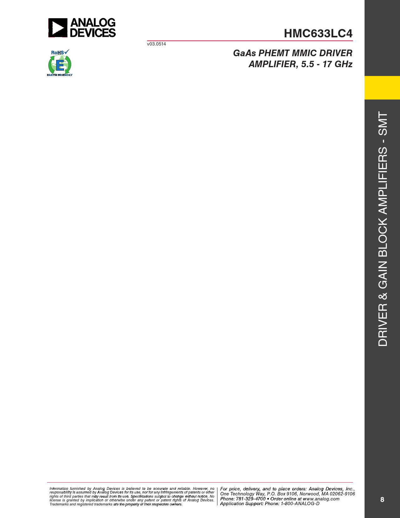 HMC633LC4 v03.0514 GaAs PHEMT MMIC DRIVERAMPLIFIER, 5.5 - 17 GHz T M S - S R IE LIF P M K A C LO IN B A R & G E IV R D I F nf o or r p mati r o in cfe ur , d nish e e l d iv b e y r A y a nalo n g d t Devi o p ces i la s c bele o ieve rd d t e o rbs e : H acc iutrtatite e M and ic reli rao bl w e. a H v o e C wever o , nrp o For price, delivery, and to place orders: Analog Devices, Inc., responsibility is assumed by Analog Devices for its use, nor for any infringements of patents or other oration, 2 Elizabeth Drive, Chelmsford, MA 01824 One Technology Way, P.O. Box 9106, Norwood, MA 02062-9106 Phone: 978-250-3343 Fax: 978-250-3373 O rights of third parties that may result from its use. Specifications subject to change without notice. No rd Phoe n r O e: 7 n- 81-li 3 n 2 e a 9-4 t w 70 ww 0 • O . rdh e itt r o it nle i . n co e a m license is granted by implication or otherwise under any patent or patent rights of Analog Devices. t www.analog.com 8 Application Support: Phon Trademarks and registered trademarks are the property of their respective owners. e: 978-250-334 A 3 o pplic r a atio pp n S s u @ p h por ittti : Pte ho.c n o e m : 1-800-ANALOG-D