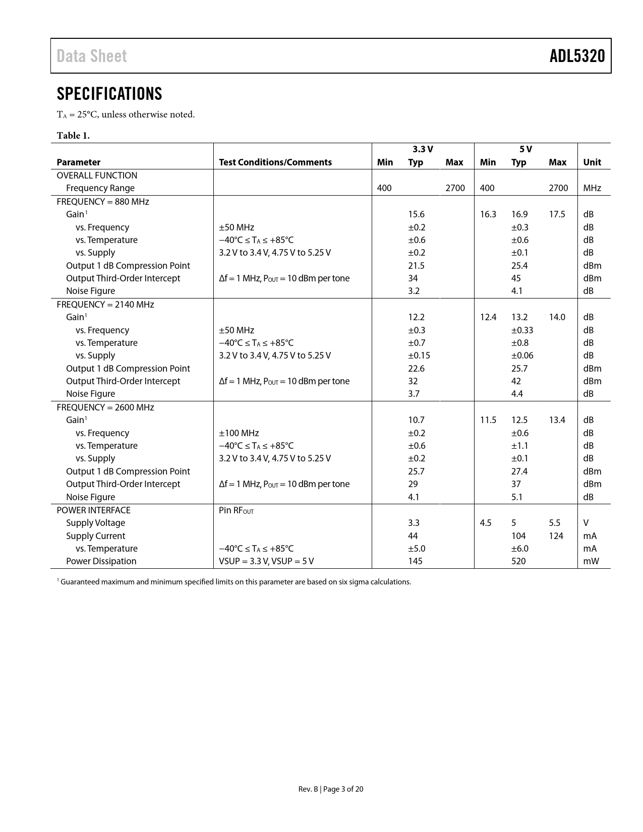 Data Sheet. ADL5320. SPECIFICATIONS. Table 1. 3.3 V. 5 V. Parameter. Test Conditions/Comments. Min. Typ. Max. Unit