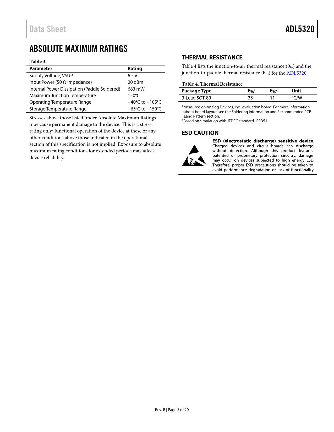 link to page 5 link to page 13 link to page 13 link to page 5 link to page 5 Data SheetADL5320ABSOLUTE MAXIMUM RATINGSTHERMAL RESISTANCETable 3. ParameterRating Table 4 lists the junction-to-air thermal resistance (θJA) and the Supply Voltage, VSUP 6.5 V junction-to-paddle thermal resistance (θJC) for the ADL5320. Input Power (50 Ω Impedance) 20 dBm Table 4. Thermal Resistance Internal Power Dissipation (Paddle Soldered) 683 mW Package Typeθ 12JAθJCUnit Maximum Junction Temperature 150°C 3-Lead SOT-89 35 11 °C/W Operating Temperature Range −40°C to +105°C Storage Temperature Range −65°C to +150°C 1 Measured on Analog Devices, Inc., evaluation board. For more information about board layout, see the Soldering Information and Recommended PCB Stresses above those listed under Absolute Maximum Ratings Land Pattern section. 2 Based on simulation with JEDEC standard JESD51. may cause permanent damage to the device. This is a stress rating only; functional operation of the device at these or any ESD CAUTION other conditions above those indicated in the operational section of this specification is not implied. Exposure to absolute maximum rating conditions for extended periods may affect device reliability. Rev. B | Page 5 of 20 Document Outline Features Applications Functional Block Diagram General Description Table of Contents Revision History Specifications Typical Scattering Parameters Absolute Maximum Ratings Thermal Resistance ESD Caution Pin Configuration and Function Descriptions Typical Performance Characteristics High Temperature and 3.3 V Operation Applications Information Basic Layout Connections Soldering Information and Recommended PCB Land Pattern Matching Procedure Optimizing OP1dB W-CDMA ACPR Performance Evaluation Board Outline Dimensions Ordering Guide