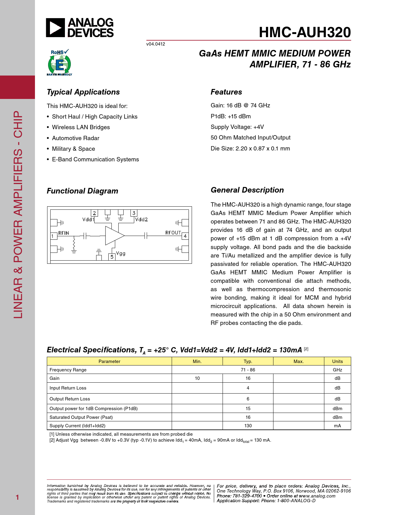 HMC-AUH320 v04.0412 GaAs HEMT MMIC MEDIUM POWERAMPLIFIER, 71 - 86 GHzTypical ApplicationsFeatures This HmC-aUH320 is ideal for: Gain: 16 dB @ 74 GHz iP • Short Haul / High Capacity Links P1dB: +15 dBm H • Wireless LAN Bridges supply Voltage: +4V • Automotive Radar 50 ohm matched input/output s - C • Military & Space Die size: 2.20 x 0.87 x 0.1 mm r • E-Band Communication Systems ie Lif P Functional DiagramGeneral Description m The HmC-aUH320 is a high dynamic range, four stage a Gaas HemT mmiC medium Power amplifier which r operates between 71 and 86 GHz. The HmC-aUH320 e provides 16 dB of gain at 74 GHz, and an output w power of +15 dBm at 1 dB compression from a +4V o supply voltage. All bond pads and the die backside are Ti/au metal ized and the amplifier device is ful y passivated for reliable operation. The HmC-aUH320 Gaas HemT mmiC medium Power amplifier is r & P compatible with conventional die attach methods, a as wel as thermocompression and thermosonic e wire bonding, making it ideal for MCM and hybrid microcircuit applications. al data shown herein is Lin measured with the chip in a 50 ohm environment and rf probes contacting the die pads. Electrical Specifications, T = +25° C, Vdd1=Vdd2 = 4V, Idd1+Idd2 = 130mA [2] A Parameter min. Typ. max. Units frequency range 71 - 86 GHz Gain 10 16 dB input return Loss 4 dB output return Loss 6 dB output power for 1dB Compression (P1dB) 15 dBm saturated output Power (Psat) 16 dBm supply Current (idd1+idd2) 130 ma [1] Unless otherwise indicated, all measurements are from probed die [2] adjust Vgg between -0.8V to +0.3V (typ -0.1V) to achieve idd1 = 40ma, idd2 = 90ma or iddtotal = 130 ma. Inf F or o m r p atio r n ifc ur e n , d ishe e d lbiv y e A r n y a alog n D d t evic o p es is la beclie o eved rd to ebre sa: H ccur iattti e tae M nd re ilicarbloew . H a o ve C wever, o n rp o For price, delivery, and to place orders: Analog Devices, Inc., responsibility is assumed by Analog Devices for its use, nor for any infringements of patents or other oration, 2 Elizabeth Drive, Chelmsford, MA 01824 One Technology Way, P.O. Box 9106, Norwood, MA 02062-9106 Phone: 978-250-3343 Fax: 978-250-3373 O rights of third parties that may result from its use. Specifications subject to change without notice. No P rd ho e ne r O : 7 n 81- -3li 2n 9 e a -47 t w 0 w 0 • O w rd .h e it r o tniltie n .c e ao t m 1 license is granted by implication or otherwise under any patent or patent rights of Analog Devices. www.analog.com Application Support: Pho Trademarks and registered trademarks are the property of their respective owners. ne: 978-250-33 A 4 p 3 o plica r a tio p n S p u s p @ po h rt itt : P ite ho . n c e o : 1m -800-ANALOG-D