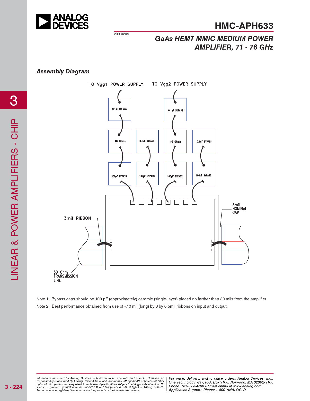 HMC-APH633 v03.0209 GaAs HEMT MMIC MEDIUM POWERAMPLIFIER, 71 - 76 GHzAssembly Diagram 3 IP H S - C R IE IF L P M R A E W O R & P A E IN L Note 1: Bypass caps should be 100 pF (approximately) ceramic (single-layer) placed no farther than 30 mils from the amplifi er Note 2: Best performance obtained from use of <10 mil (long) by 3 by 0.5mil ribbons on input and output. Information furnish F ed obr pri y Anal ce, de og Device li s vie s r beyli, a eve nd to pla d to be accura ce o te and rder reliabl s e , pl . Ho ease co wever, no For price, delivery, and to place orders: Analog Devices, Inc., responsibility is assumed by Analog Devices for its use, nor for any infringements of patents or other ntact Hittite Microwave Corporation: One Technology Way, P.O. Box 9106, Norwood, MA 02062-9106 rights of third parties that may result from its use. Specifications subject to change without notice. No 3 - 224 20 Alpha Road, Chelmsford, MA 01824 Phone: 978 Phon - e 25 : 7 0 81--3 32 3 9 4 - 3 F 70 ax 0 • O : 978 rder on -li25 n 0 e a - t 33 ww 73 license is granted by implication or otherwise under any patent or patent rights of Analog Devices. w.analog.com Order On Trademarks and registered trademarks are the property of their respective owners. -line at www.h A it p tpite.co licatio m n Support: Phone: 1-800-ANALOG-D
