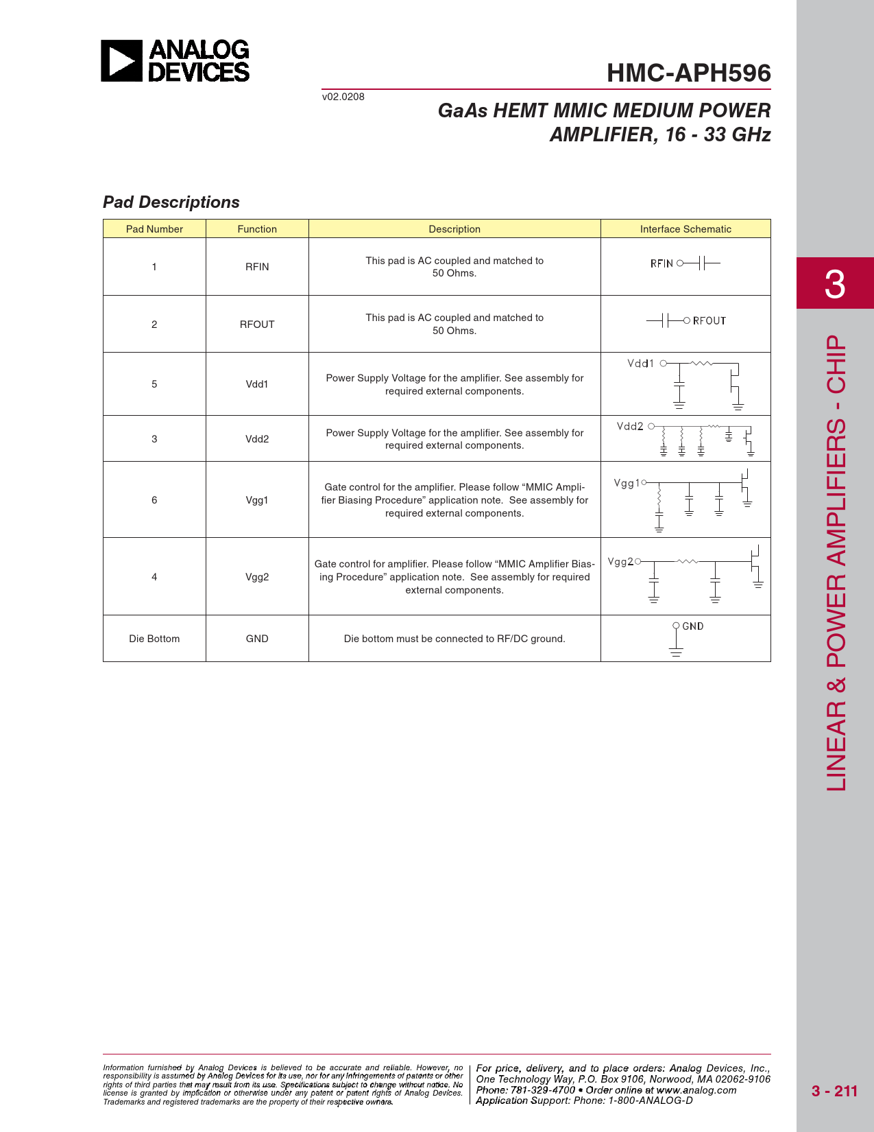 HMC-APH596 v02.0208 GaAs HEMT MMIC MEDIUM POWERAMPLIFIER, 16 - 33 GHzPad Descriptions Pad Number Function Description Interface Schematic This pad is AC coupled and matched to 1 RFIN 50 Ohms. 3 This pad is AC coupled and matched to 2 RFOUT 50 Ohms. IP H Power Supply Voltage for the amplifi er. See assembly for 5 Vdd1 required external components. Power Supply Voltage for the amplifi er. See assembly for S - C 3 Vdd2 required external components. R IE Gate control for the amplifi er. Please follow “MMIC Ampli- IF 6 Vgg1 fi er Biasing Procedure” application note. See assembly for L required external components. P M Gate control for amplifi er. Please follow “MMIC Amplifi er Bias- 4 Vgg2 ing Procedure” application note. See assembly for required external components. R A E W Die Bottom GND Die bottom must be connected to RF/DC ground. O R & P A E IN L Information furnish F e o d r pri by An ce, de alog Devic leis vie s rby eli, a eve nd to pla d to be accur ce o ate an r d der relia s ble , pl . Ho ease co wever, no For price, delivery, and to place orders: Analog Devices, Inc., responsibility is assumed by Analog Devices for its use, nor for any infringements of patents or other ntact Hittite Microwave Corporation: One Technology Way, P.O. Box 9106, Norwood, MA 02062-9106 20 Alpha Road, Chelmsford, MA 01824 Phone rights of third parties that may result from its use. Specifications subject to change without notice. No : 978 Phon -e25 : 7 0 81 - - 3 3 3 29 4 - 3 F 470 ax 0 • O : 978 rder o - nl 25 in 0 e a - t 33 ww 73 license is granted by implication or otherwise under any patent or patent rights of Analog Devices. w.analog.com 3 - 211 Order On- Trademarks and registered trademarks are the property of their respective owners. line at www.hi A tptipte.co licatio m n Support: Phone: 1-800-ANALOG-D
