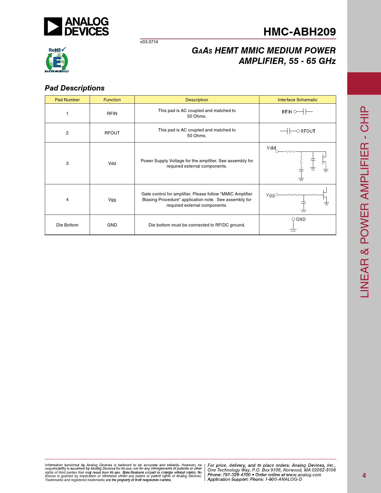 HMC-ABH209 v03.0714 Gaas HEMT MMIC MEDIUM POWERAMPLIFIER, 55 - 65 GHzPad Descriptions Pad Number Function Description Interface Schematic This pad is AC coupled and matched to 1 RFIN 50 Ohms. IP H This pad is AC coupled and matched to 2 RFOUT 50 Ohms. R - C Power Supply Voltage for the amplifier. See assembly for IE 3 Vdd required external components. LIF P M Gate control for amplifier. Please follow “MMIC Amplifier 4 Vgg Biasing Procedure” application note. See assembly for required external components. R A E Die Bottom GND Die bottom must be connected to RF/DC ground. W O R & P A E LIN Inf F or o m r p atio r n ifc ur e n , d ishe e d lbiv y e A r n y a alog n D d t evic o p es is la beclie o eved rd to ebre sa: H ccur iattti e tae M nd re ilicarbloew . H a o ve C wever, o n rp o For price, delivery, and to place orders: Analog Devices, Inc., responsibility is assumed by Analog Devices for its use, nor for any infringements of patents or other oration, 2 Elizabeth Drive, Chelmsford, MA 01824 One Technology Way, P.O. Box 9106, Norwood, MA 02062-9106 Phone: 978-250-3343 Fax: 978-250-3373 O rights of third parties that may result from its use. Specifications subject to change without notice. No P rd hone e r O : 7 n 81- -3li 2n 9 e a -47 t w 0 w 0 • O w rd .h e it r o t niltie n .c e ao t m license is granted by implication or otherwise under any patent or patent rights of Analog Devices. www.analog.com 4 Application Support: Pho Trademarks and registered trademarks are the property of their respective owners. ne: 978-250-33 A 4 p 3 p o lica rti a o p n S p u s p @ po h rt itt : P ite ho . n c e om : 1-800-ANALOG-D