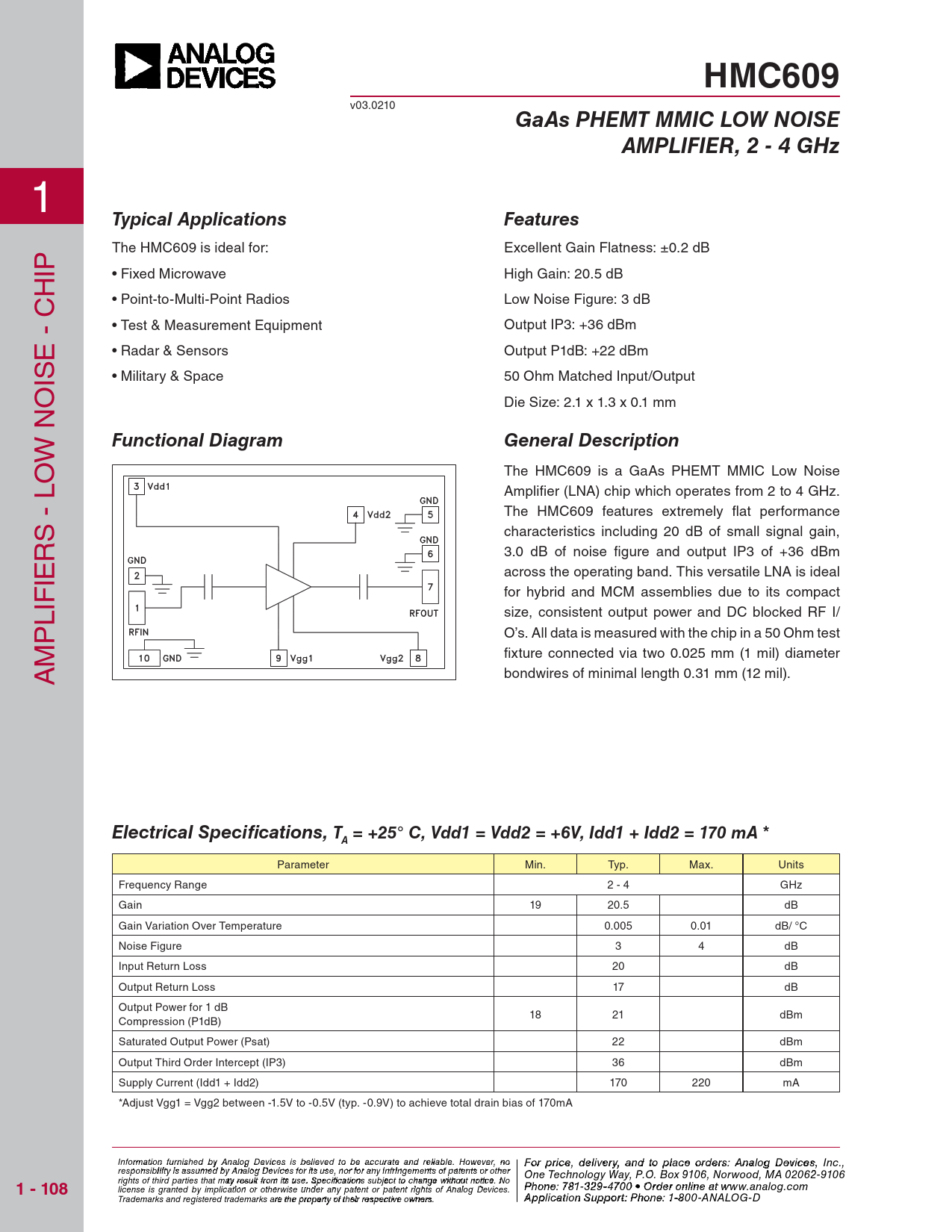HMC609. GaAs PHEMT MMIC LOW NOISE. AMPLIFIER, 2 - 4 GHz. Typical Applications. Features. Functional Diagram. General Description