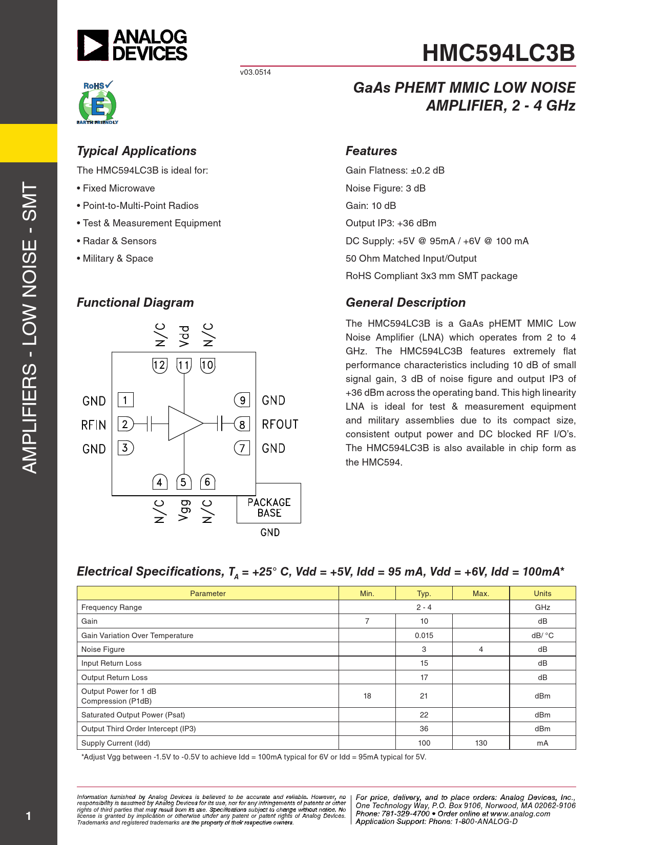 HMC594LC3B v03.0514 GaAs PHEMT MMIC LOW NOISEAMPLIFIER, 2 - 4 GHzTypical ApplicationsFeatures The HMC594LC3B is ideal for: Gain Flatness: ±0.2 dB T • Fixed Microwave Noise Figure: 3 dB M • Point-to-Multi-Point Radios Gain: 10 dB • Test & Measurement Equipment Output IP3: +36 dBm E - S • Radar & Sensors DC Supply: +5V @ 95mA / +6V @ 100 mA IS • Military & Space 50 Ohm Matched Input/Output O RoHS Compliant 3x3 mm SMT package Functional DiagramGeneral Description W N O The HMC594LC3B is a GaAs pHEMT MMIC Low Noise Amplifier (LNA) which operates from 2 to 4 GHz. The HMC594LC3B features extremely flat S - L performance characteristics including 10 dB of small R signal gain, 3 dB of noise figure and output IP3 of IE +36 dBm across the operating band. This high linearity LNA is ideal for test & measurement equipment LIF and military assemblies due to its compact size, P consistent output power and DC blocked RF I/O’s. M The HMC594LC3B is also available in chip form as A the HMC594. Electrical Specifications, T = +25° C, Vdd = +5V, Idd = 95 mA, Vdd = +6V, Idd = 100mA*A Parameter Min. Typ. Max. Units Frequency Range 2 - 4 GHz Gain 7 10 dB Gain Variation Over Temperature 0.015 dB/ °C Noise Figure 3 4 dB Input Return Loss 15 dB Output Return Loss 17 dB Output Power for 1 dB 18 21 dBm Compression (P1dB) Saturated Output Power (Psat) 22 dBm Output Third Order Intercept (IP3) 36 dBm Supply Current (Idd) 100 130 mA *Adjust Vgg between -1.5V to -0.5V to achieve Idd = 100mA typical for 6V or Idd = 95mA typical for 5V. Inf F or o m r p atio r n ifc ur e n , d ishe e d lbiv y e A r n y a alog n D d t evic o p es is la beclie o eved rd to ebre sa: H ccur iattti e tae M nd re ilicarbloew . H a o ve C wever, o n rp o For price, delivery, and to place orders: Analog Devices, Inc., responsibility is assumed by Analog Devices for its use, nor for any infringements of patents or other oration, 2 Elizabeth Drive, Chelmsford, MA 01824 One Technology Way, P.O. Box 9106, Norwood, MA 02062-9106 Phone: 978-250-3343 Fax: 978-250-3373 O rights of third parties that may result from its use. Specifications subject to change without notice. No P rd hone e r O : 7 n 81- -3li 2n 9 e a -47 t w 0 w 0 • O w rd .h e it r o t niltie n .c e ao t m 1 license is granted by implication or otherwise under any patent or patent rights of Analog Devices. www.analog.com Application Support: Pho Trademarks and registered trademarks are the property of their respective owners. ne: 978-250-33 A 4 p 3 o plica r a tio p n S p u s p @ po h rt itt : P ite ho . n c e o : 1m -800-ANALOG-D