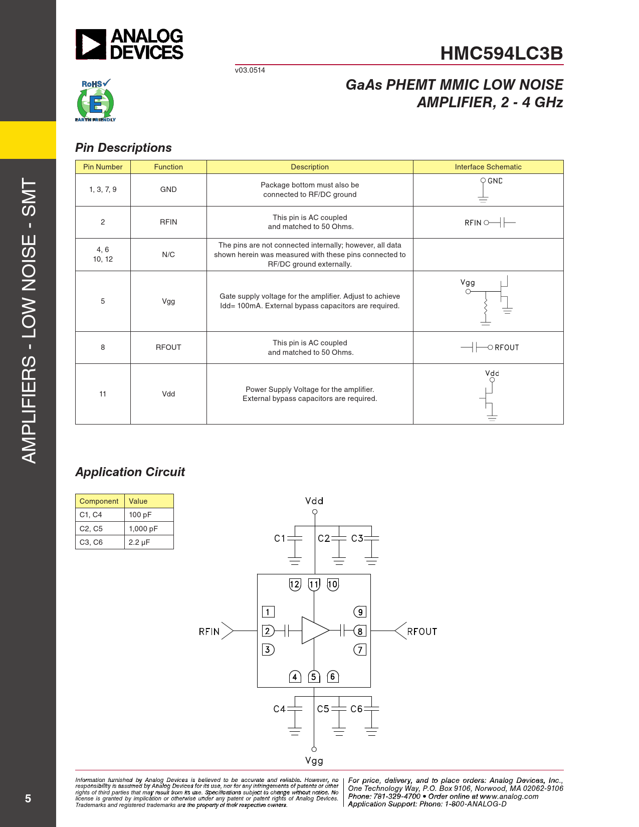 HMC594LC3B v03.0514 GaAs PHEMT MMIC LOW NOISEAMPLIFIER, 2 - 4 GHzPin Descriptions Pin Number Function Description Interface Schematic T Package bottom must also be M 1, 3, 7, 9 GND connected to RF/DC ground This pin is AC coupled 2 RFIN and matched to 50 Ohms. E - S The pins are not connected internally; however, all data IS 4, 6 N/C shown herein was measured with these pins connected to 10, 12 O RF/DC ground externally. Gate supply voltage for the amplifier. Adjust to achieve W N 5 Vgg Idd= 100mA. External bypass capacitors are required. O This pin is AC coupled 8 RFOUT S - L and matched to 50 Ohms. R IE Power Supply Voltage for the amplifier. 11 Vdd External bypass capacitors are required. LIF P M A Application Circuit Component Value C1, C4 100 pF C2, C5 1,000 pF C3, C6 2.2 µF Inf F or o m r p atio r n ifc ur e n , d ishe e d lbiv y e A r n y a alog n D d t evic o p es is la beclie o eved rd to ebre sa: H ccur iattti e tae M nd re ilicarbloew . H a o ve C wever, o n rp o For price, delivery, and to place orders: Analog Devices, Inc., responsibility is assumed by Analog Devices for its use, nor for any infringements of patents or other oration, 2 Elizabeth Drive, Chelmsford, MA 01824 One Technology Way, P.O. Box 9106, Norwood, MA 02062-9106 Phone: 978-250-3343 Fax: 978-250-3373 O rights of third parties that may result from its use. Specifications subject to change without notice. No P rd hone e r O : 7 n 81- -3li 2n 9 e a -47 t w 0 w 0 • O w rd .h e it r o t niltie n .c e ao t m 5 license is granted by implication or otherwise under any patent or patent rights of Analog Devices. www.analog.com Application Support: Pho Trademarks and registered trademarks are the property of their respective owners. ne: 978-250-33 A 4 p 3 o plica r a tio p n S p u s p @ po h rt itt : P ite ho . n c e o : 1m -800-ANALOG-D
