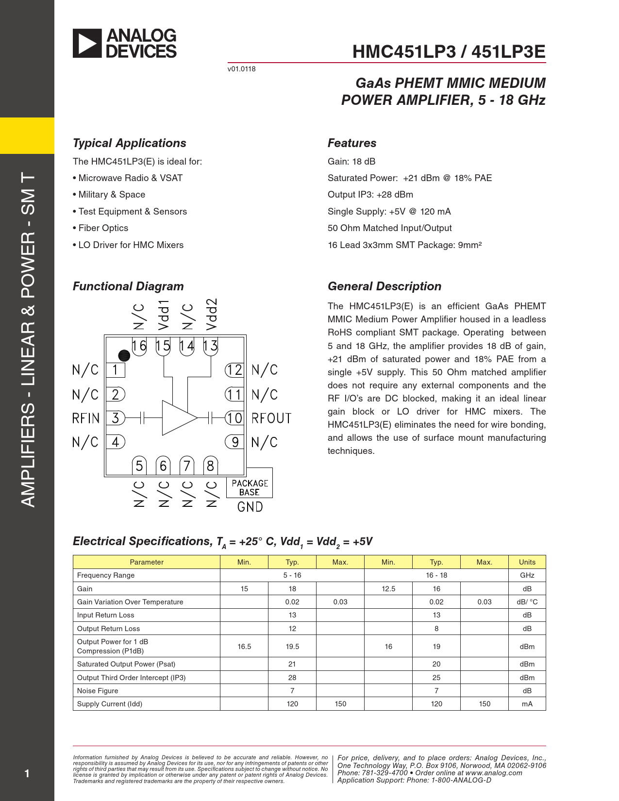 The HmC451lp3(e) is an efficient GaAs pHemT r & mmiC medium power Amplifier housed in a leadless A roHs compliant smT package. operating between e 5 and 18 GHz, the amplifier provides 18 dB of gain, +21 dBm of saturated power and 18% pAe from a lin single +5V supply. This 50 ohm matched amplifier does not require any external components and the s - rf i/o’s are DC blocked, making it an ideal linear r gain block or lo driver for HmC mixers. The HmC451lp3(e) eliminates the need for wire bonding, ie and al ows the use of surface mount manufacturing techniques. lif p m A
