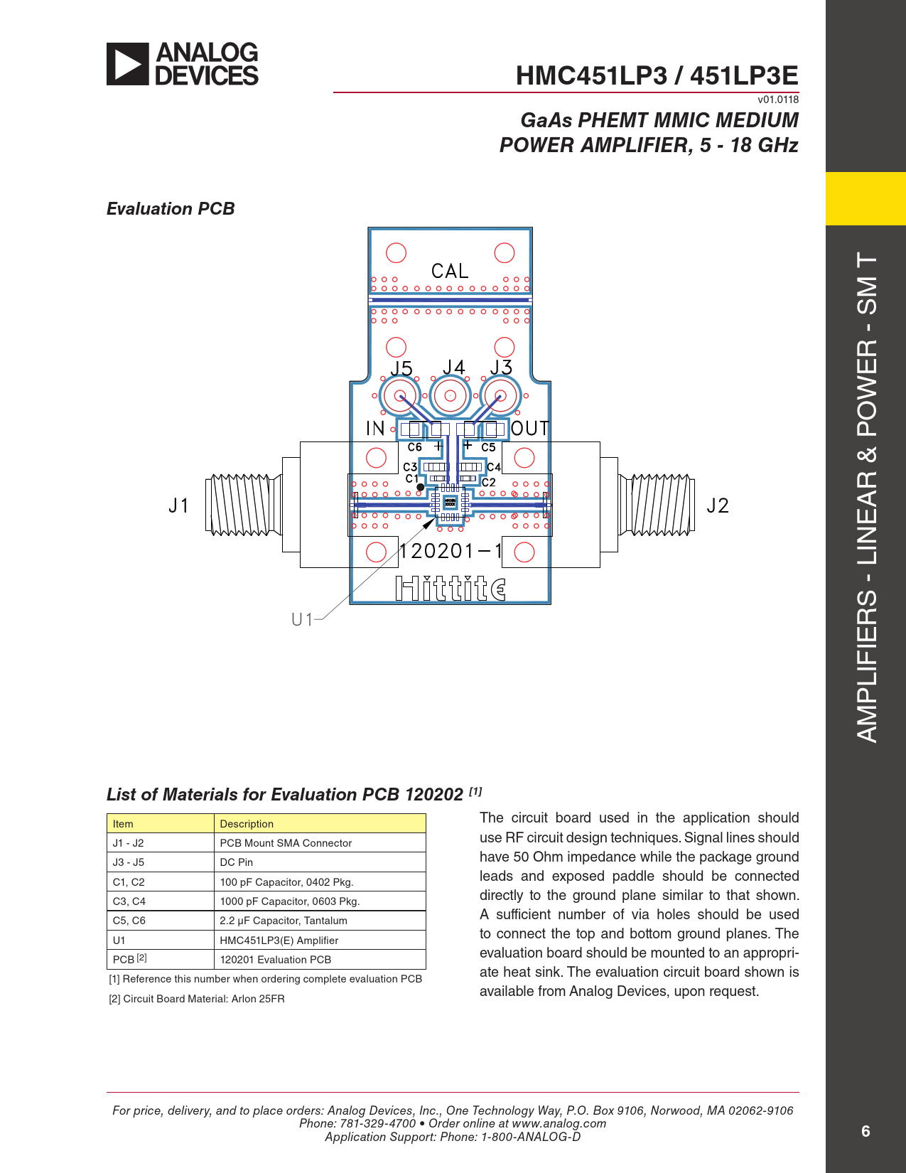 HMC451LP3 / 451LP3E v01.0118 GaAs PHEMT MMIC MEDIUMPOWER AMPLIFIER, 5 - 18 GHzEvaluation PCB T m s r - e w o p r & A e lin s - r ie lif p m A List of Materials for Evaluation PCB 120202 [1] The circuit board used in the application should item Description use rf circuit design techniques. signal lines should J1 - J2 pCB mount smA Connector have 50 ohm impedance while the package ground J3 - J5 DC pin leads and exposed paddle should be connected C1, C2 100 pf Capacitor, 0402 pkg. directly to the ground plane similar to that shown. C3, C4 1000 pf Capacitor, 0603 pkg. A sufficient number of via holes should be used C5, C6 2.2 µf Capacitor, Tantalum to connect the top and bottom ground planes. The U1 HmC451lp3(e) Amplifier evaluation board should be mounted to an appropri- pCB [2] 120201 evaluation pCB ate heat sink. The evaluation circuit board shown is [1] reference this number when ordering complete evaluation pCB available from Analog Devices, upon request. [2] Circuit Board material: Arlon 25fr For price, delivery, and to place orders: Analog Devices, Inc., One Technology Way, P.O. Box 9106, Norwood, MA 02062-9106 Phone: 781-329-4700 • Order online at www.analog.com Application Support: Phone: 1-800-ANALOG-D 6