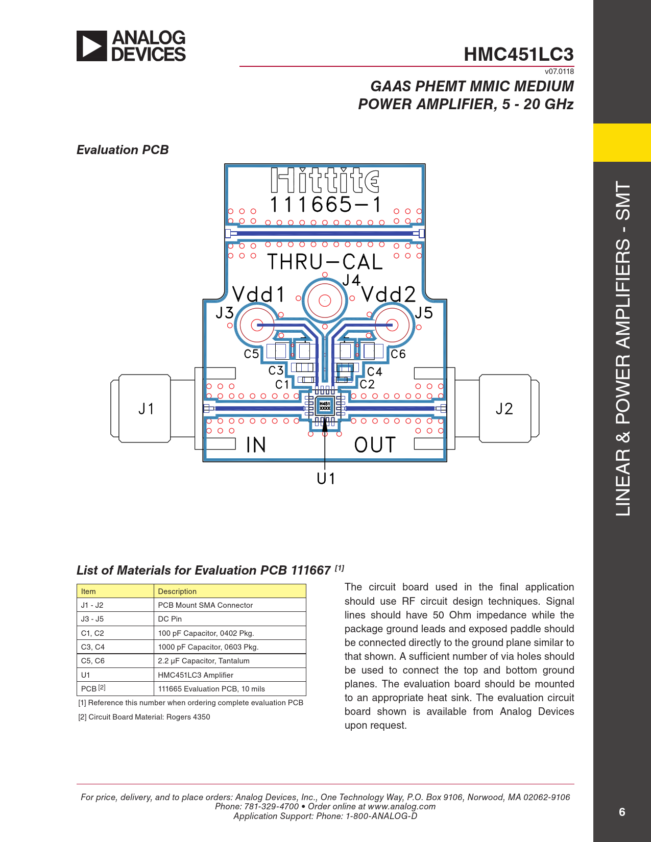 HMC451LC3 v07.0118 Gaas PHEMT MMIC MEDIUMPOWER aMPLIFIER, 5 - 20 GHzEvaluation PCB T M S - S R IE LIF P M R A E W O R & P A E LIN List of Materials for Evaluation PCB 111667 [1] The circuit board used in the final application Item Description should use RF circuit design techniques. Signal J1 - J2 PCB Mount SMA Connector lines should have 50 Ohm impedance while the J3 - J5 DC Pin package ground leads and exposed paddle should C1, C2 100 pF Capacitor, 0402 Pkg. be connected directly to the ground plane similar to C3, C4 1000 pF Capacitor, 0603 Pkg. that shown. A sufficient number of via holes should C5, C6 2.2 µF Capacitor, Tantalum be used to connect the top and bottom ground U1 HMC451LC3 Amplifier planes. The evaluation board should be mounted PCB [2] 111665 Evaluation PCB, 10 mils to an appropriate heat sink. The evaluation circuit [1] Reference this number when ordering complete evaluation PCB board shown is available from Analog Devices [2] Circuit Board Material: Rogers 4350 upon request. For price, delivery, and to place orders: Analog Devices, Inc., One Technology Way, P.O. Box 9106, Norwood, MA 02062-9106 Phone: 781-329-4700 • Order online at www.analog.com Application Support: Phone: 1-800-ANALOG-D 6