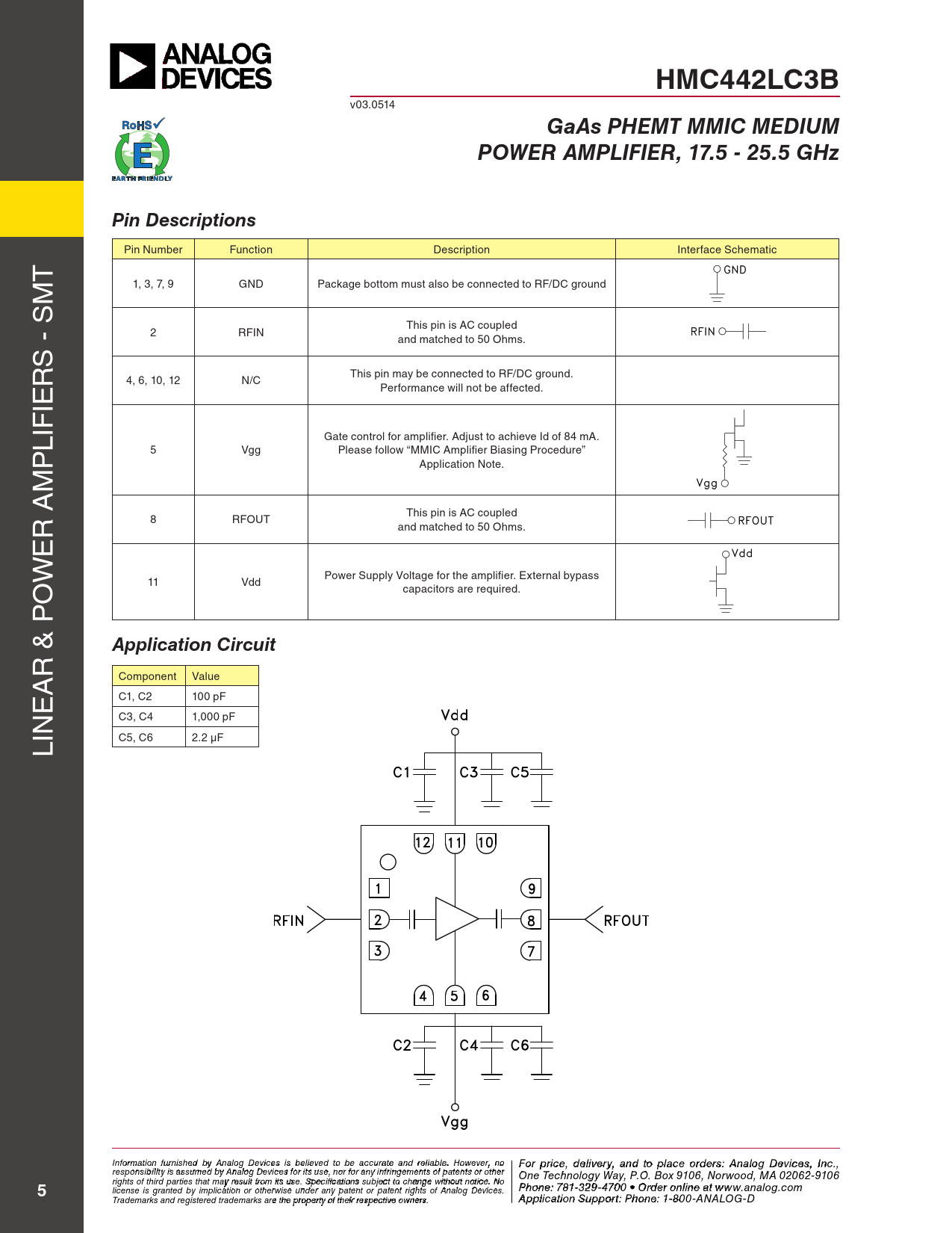 HMC442LC3B. GaAs PHEMT MMIC MEDIUM. POWER AMPLIFIER, 17.5 - 25.5 GHz. Pin Descriptions. Application Circuit