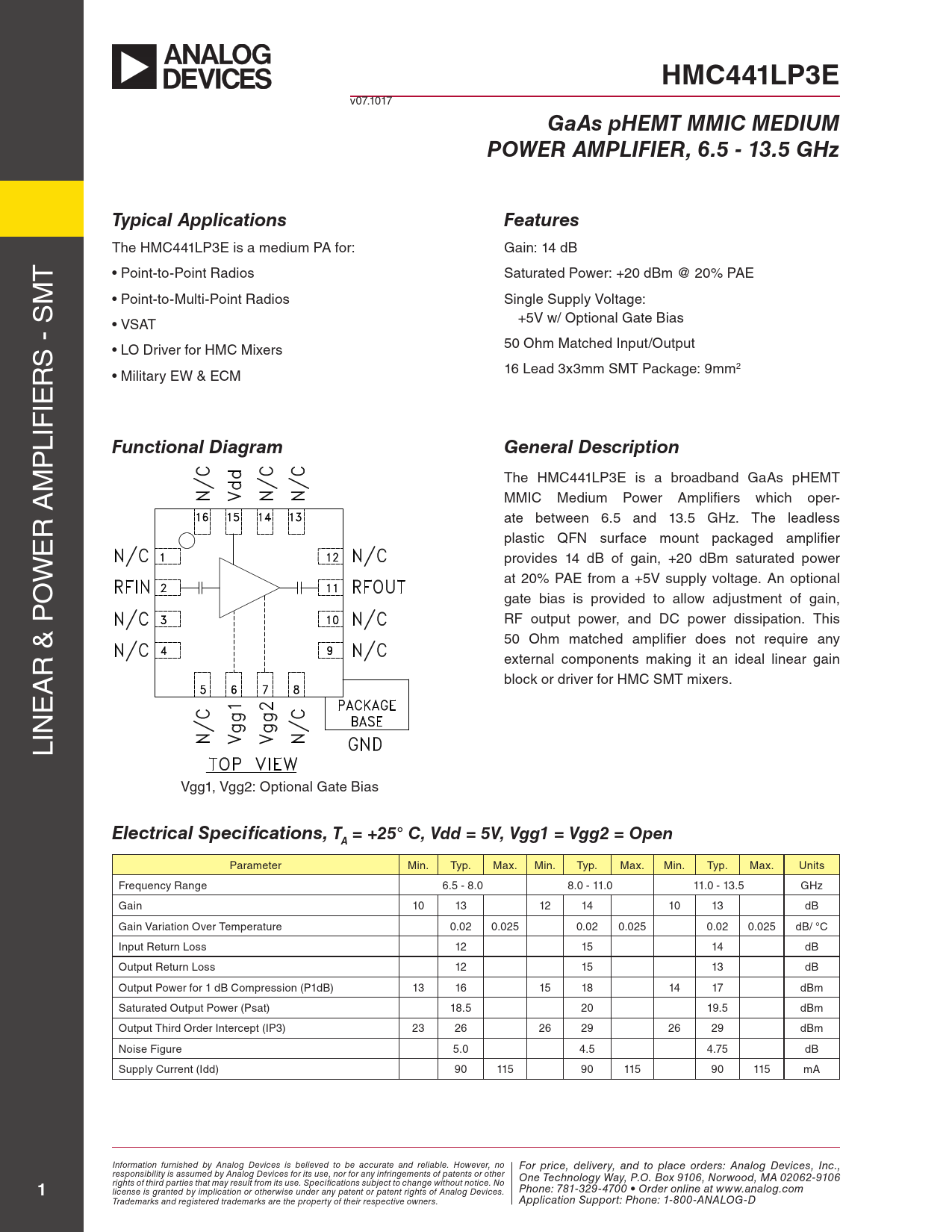 HMC441LP3E. GaAs pHEMT MMIC MEDIUM. POWER AMPLIFIER, 6.5 - 13.5 GHz. Typical Applications. Features. Functional Diagram