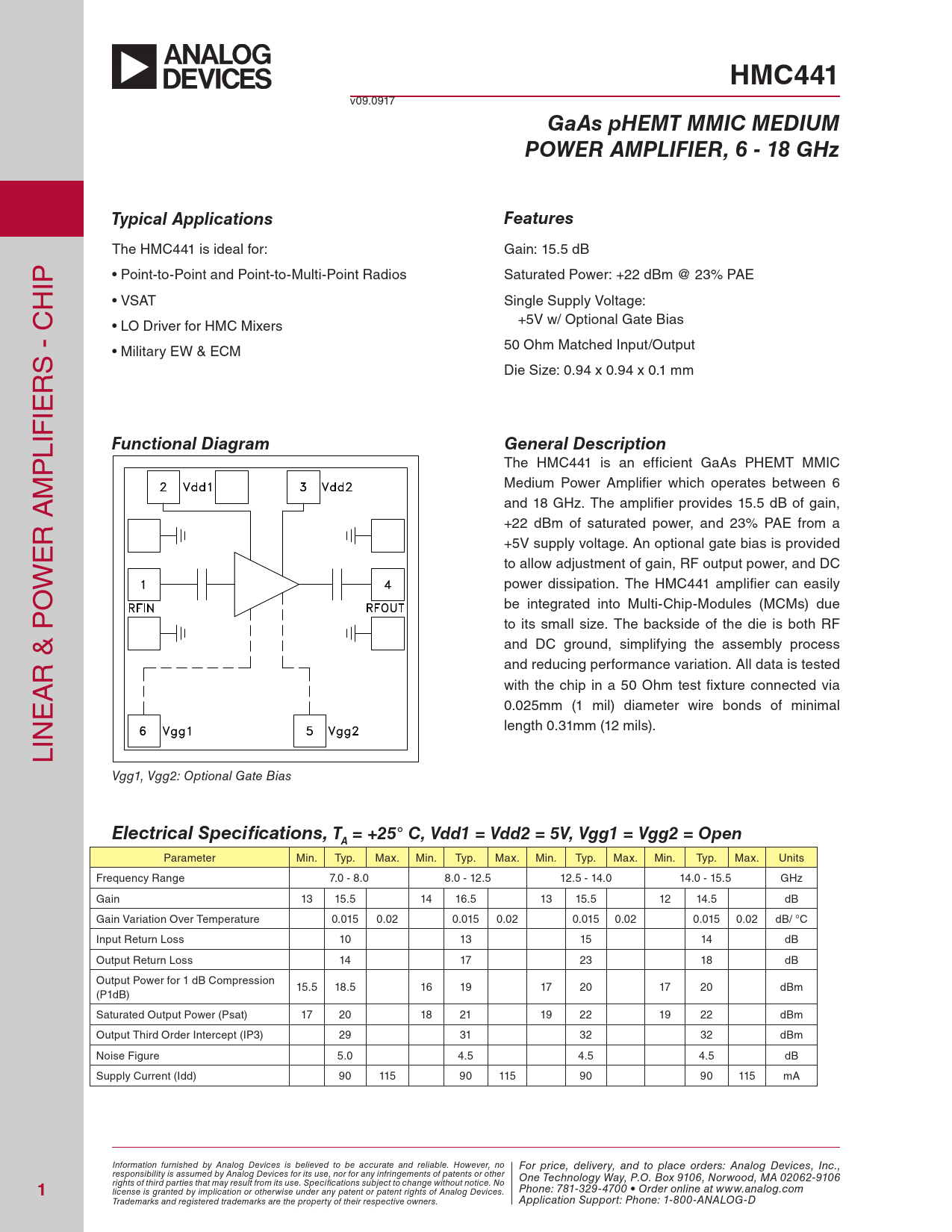 HMC441 v09.0917 GaAs pHEMT MMIC MEDIUMPOWER AMPLIFIER, 6 - 18 GHzTypical ApplicationsFeatures The HMC441 is ideal for: Gain: 15.5 dB IP • Point-to-Point and Point-to-Multi-Point Radios Saturated Power: +22 dBm @ 23% PAE H • VSAT Single Supply Voltage: +5V w/ Optional Gate Bias • LO Driver for HMC Mixers 50 Ohm Matched Input/Output S - C • Military EW & ECM R Die Size: 0.94 x 0.94 x 0.1 mm IE LIF Functional DiagramGeneral Description P The HMC441 is an efficient GaAs PHEMT MMIC M Medium Power Amplifier which operates between 6 and 18 GHz. The amplifier provides 15.5 dB of gain, R A +22 dBm of saturated power, and 23% PAE from a E +5V supply voltage. An optional gate bias is provided to al ow adjustment of gain, RF output power, and DC W power dissipation. The HMC441 amplifier can easily O be integrated into Multi-Chip-Modules (MCMs) due to its small size. The backside of the die is both RF and DC ground, simplifying the assembly process R & P and reducing performance variation. All data is tested A with the chip in a 50 Ohm test fixture connected via E 0.025mm (1 mil) diameter wire bonds of minimal length 0.31mm (12 mils). LIN Vgg1, Vgg2: Optional Gate Bias Electrical Specifications, T = +25° C, Vdd1 = Vdd2 = 5V, Vgg1 = Vgg2 = OpenA Parameter Min. Typ. Max. Min. Typ. Max. Min. Typ. Max. Min. Typ. Max. Units Frequency Range 7.0 - 8.0 8.0 - 12.5 12.5 - 14.0 14.0 - 15.5 GHz Gain 13 15.5 14 16.5 13 15.5 12 14.5 dB Gain Variation Over Temperature 0.015 0.02 0.015 0.02 0.015 0.02 0.015 0.02 dB/ °C Input Return Loss 10 13 15 14 dB Output Return Loss 14 17 23 18 dB Output Power for 1 dB Compression 15.5 18.5 16 19 17 20 17 20 dBm (P1dB) Saturated Output Power (Psat) 17 20 18 21 19 22 19 22 dBm Output Third Order Intercept (IP3) 29 31 32 32 dBm Noise Figure 5.0 4.5 4.5 4.5 dB Supply Current (Idd) 90 115 90 115 90 90 115 mA Information furnished by Analog Devices is believed to be accurate and reliable. However, no For price, delivery, and to place orders: Analog Devices, Inc., responsibility is assumed by Analog Devices for its use, nor for any infringements of patents or other One Technology Way, P.O. Box 9106, Norwood, MA 02062-9106 1 rights of third parties that may result from its use. Specifications subject to change without notice. No Phone: 781-329-4700 • Order online at www.analog.com license is granted by implication or otherwise under any patent or patent rights of Analog Devices. Trademarks and registered trademarks are the property of their respective owners. Application Support: Phone: 1-800-ANALOG-D