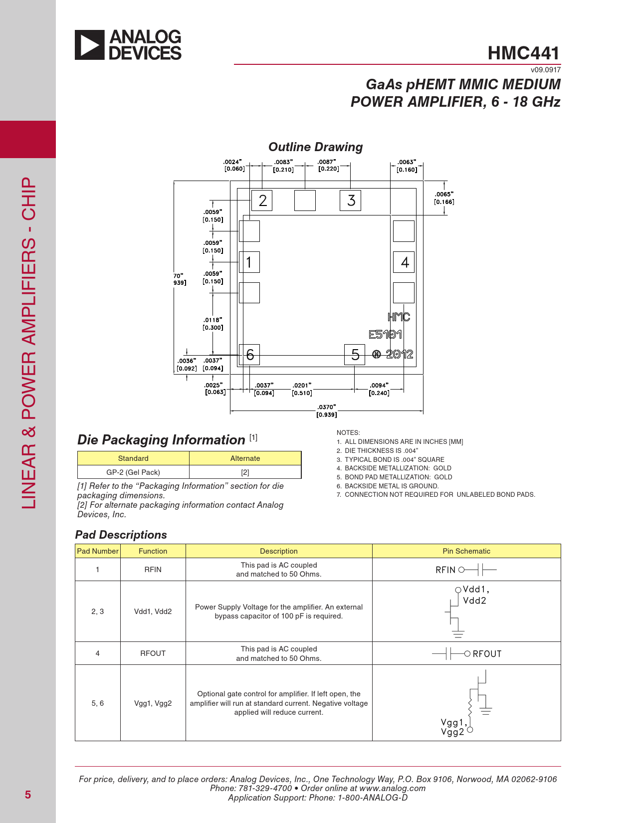 HMC441 v09.0917 GaAs pHEMT MMIC MEDIUMPOWER AMPLIFIER, 6 - 18 GHzOutline Drawing IP H S - C R IE LIF P M R A E W O NOTES: R & P Die Packaging Information [1] 1. ALL DIMENSIONS ARE IN INCHES [MM] 2. DIE THICKNESS IS .004” A Standard Alternate 3. TYPICAL BOND IS .004” SQUARE E 4. BACKSIDE METALLIZATION: GOLD GP-2 (Gel Pack) [2] 5. BOND PAD METALLIZATION: GOLD [1] Refer to the “Packaging Information” section for die 6. BACKSIDE METAL IS GROUND. LIN packaging dimensions. 7. CONNECTION NOT REQUIRED FOR UNLABELED BOND PADS. [2] For alternate packaging information contact Analog Devices, Inc. Pad Descriptions Pad Number Function Description Pin Schematic This pad is AC coupled 1 RFIN and matched to 50 Ohms. Power Supply Voltage for the amplifier. An external 2, 3 Vdd1, Vdd2 bypass capacitor of 100 pF is required. This pad is AC coupled 4 RFOUT and matched to 50 Ohms. Optional gate control for amplifier. If left open, the 5, 6 Vgg1, Vgg2 amplifier will run at standard current. Negative voltage applied will reduce current. For price, delivery, and to place orders: Analog Devices, Inc., One Technology Way, P.O. Box 9106, Norwood, MA 02062-9106 Phone: 781-329-4700 • Order online at www.analog.com 5 Application Support: Phone: 1-800-ANALOG-D