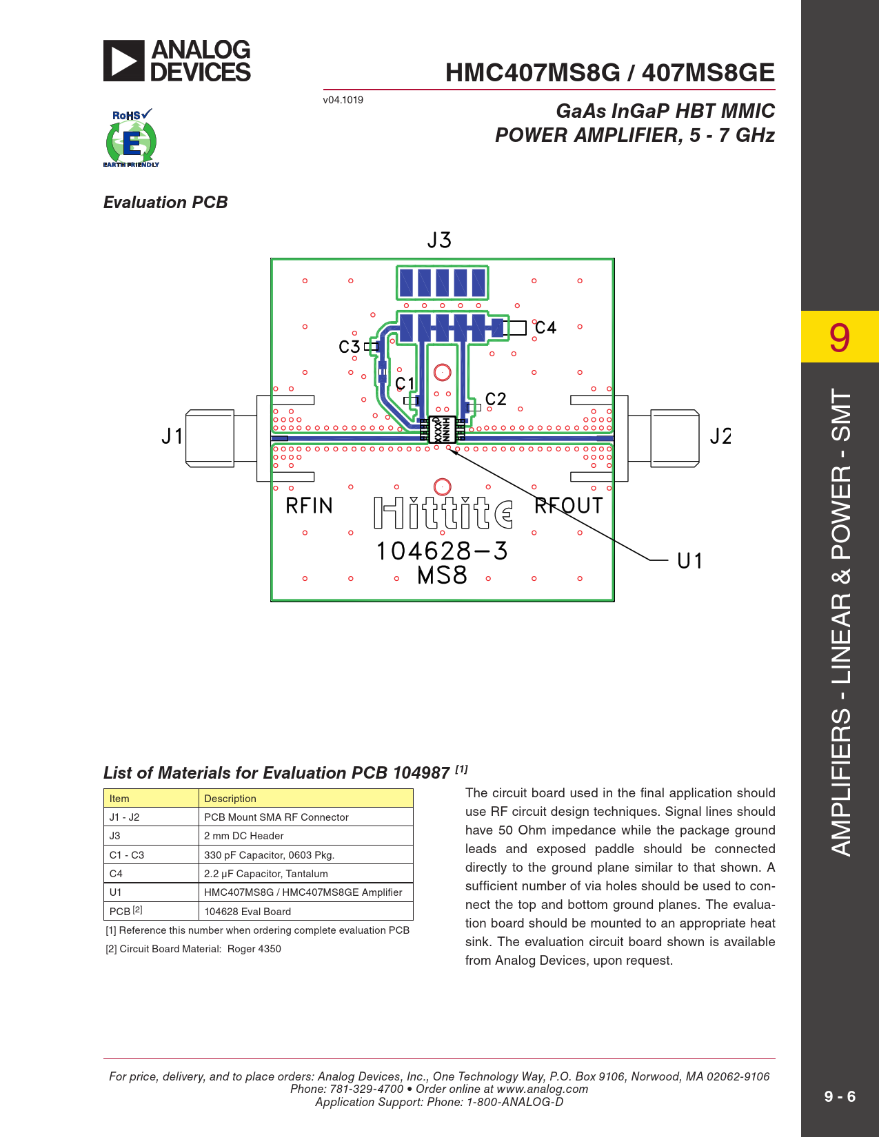 HMC407MS8G / 407MS8GE v04.1019 GaAs InGaP HBT MMICPOWER AMPLIFIER, 5 - 7 GHzEvaluation PCB 9 T M R - S E W O R & P A E IN S - L R IE List of Materials for Evaluation PCB 104987 [1] The circuit board used in the final application should Item Description LIF use RF circuit design techniques. Signal lines should J1 - J2 PCB Mount SMA RF Connector P have 50 Ohm impedance while the package ground J3 2 mm DC Header M leads and exposed paddle should be connected C1 - C3 330 pF Capacitor, 0603 Pkg. A directly to the ground plane similar to that shown. A C4 2.2 µF Capacitor, Tantalum sufficient number of via holes should be used to con- U1 HMC407MS8G / HMC407MS8GE Amplifier nect the top and bottom ground planes. The evalua- PCB [2] 104628 Eval Board tion board should be mounted to an appropriate heat [1] Reference this number when ordering complete evaluation PCB sink. The evaluation circuit board shown is available [2] Circuit Board Material: Roger 4350 from Analog Devices, upon request. For price, delivery, and to place orders: Analog Devices, Inc., One Technology Way, P.O. Box 9106, Norwood, MA 02062-9106 Phone: 781-329-4700 • Order online at www.analog.com 9 - 6 Application Support: Phone: 1-800-ANALOG-D