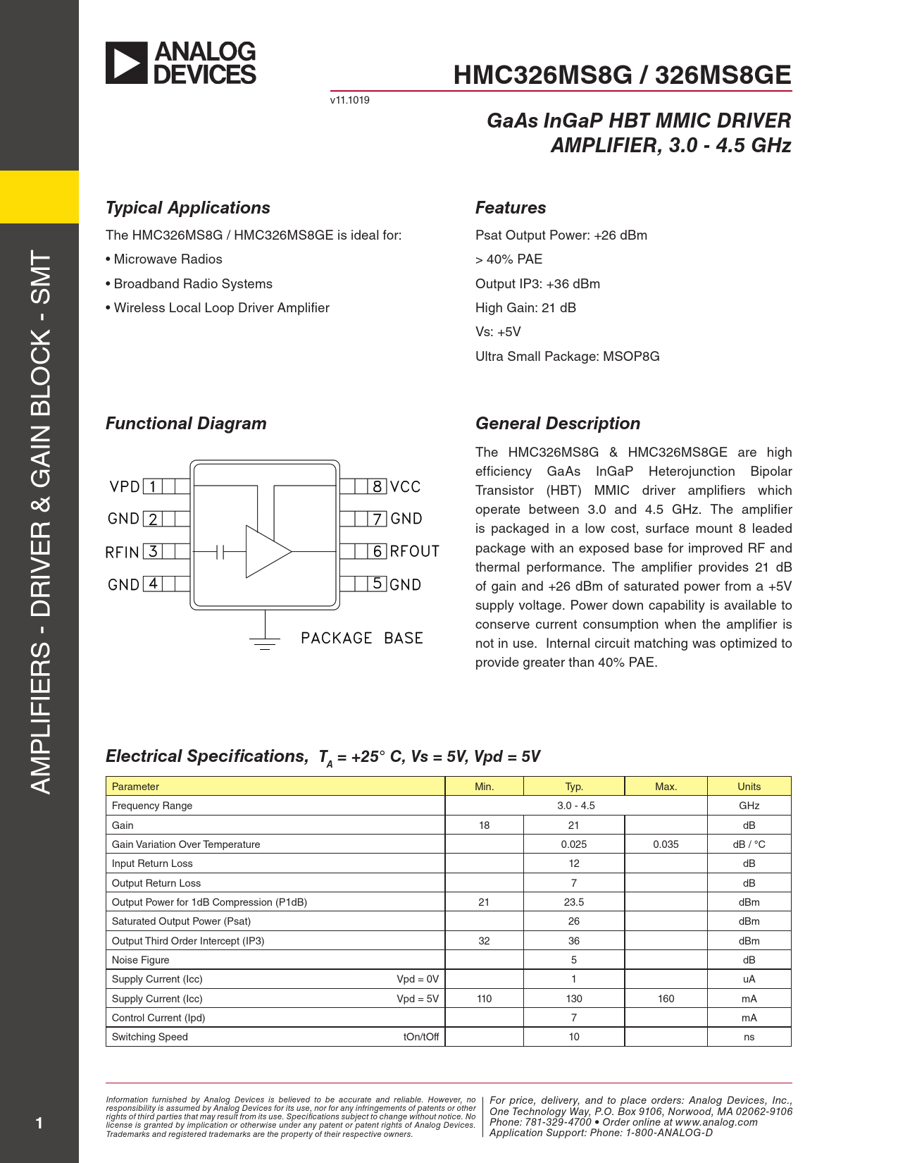 HMC326MS8G / 326MS8GE v11.1019 GaAs InGaP HBT MMIC DRIVERAMPLIFIER, 3.0 - 4.5 GHzTypical ApplicationsFeatures The HMC326MS8G / HMC326MS8GE is ideal for: Psat Output Power: +26 dBm T • Microwave Radios > 40% PAE M • Broadband Radio Systems Output IP3: +36 dBm • Wireless Local Loop Driver Amplifier High Gain: 21 dB K - S Vs: +5V C Ultra Small Package: MSOP8G LO Functional DiagramGeneral Description IN B A The HMC326MS8G & HMC326MS8GE are high efficiency GaAs InGaP Heterojunction Bipolar Transistor (HBT) MMIC driver amplifiers which operate between 3.0 and 4.5 GHz. The amplifier R & G is packaged in a low cost, surface mount 8 leaded E package with an exposed base for improved RF and IV thermal performance. The amplifier provides 21 dB R of gain and +26 dBm of saturated power from a +5V supply voltage. Power down capability is available to conserve current consumption when the amplifier is S - D not in use. Internal circuit matching was optimized to R provide greater than 40% PAE. IE LIF P M Electrical Specifications, T = +25° C, Vs = 5V, Vpd = 5VA A Parameter Min. Typ. Max. Units Frequency Range 3.0 - 4.5 GHz Gain 18 21 dB Gain Variation Over Temperature 0.025 0.035 dB / ° C Input Return Loss 12 dB Output Return Loss 7 dB Output Power for 1dB Compression (P1dB) 21 23.5 dBm Saturated Output Power (Psat) 26 dBm Output Third Order Intercept (IP3) 32 36 dBm Noise Figure 5 dB Supply Current (Icc) Vpd = 0V 1 uA Supply Current (Icc) Vpd = 5V 110 130 160 mA Control Current (Ipd) 7 mA Switching Speed tOn/tOff 10 ns Information furnished by Analog Devices is believed to be accurate and reliable. However, no For price, delivery, and to place orders: Analog Devices, Inc., responsibility is assumed by Analog Devices for its use, nor for any infringements of patents or other One Technology Way, P.O. Box 9106, Norwood, MA 02062-9106 1 rights of third parties that may result from its use. Specifications subject to change without notice. No Phone: 781-329-4700 • Order online at www.analog.com license is granted by implication or otherwise under any patent or patent rights of Analog Devices. Trademarks and registered trademarks are the property of their respective owners. Application Support: Phone: 1-800-ANALOG-D Document Outline Typical Applications Features Functional Diagram General Description Electrical Specifications Performanc Characteristics Broadband Gain & Return Loss Gain vs. Temperature P1dB vs. Temperature Psat vs. Temperature Output IP3 vs. Temperature Power Compression @ 3.5 GHz Input Return Loss vs. Temperature Output Return Loss vs. Temperature Reverse Isolation vs. Temperature Noise Figure vs. Temperature Gain, Power & Quiescent Supply Current vs. Vpd @3.5 GHz Absolute Maximum Ratings Outline Drawing Package Information Evaluation PCB List of Materials for Evaluation PCB 104356 Application Circuit