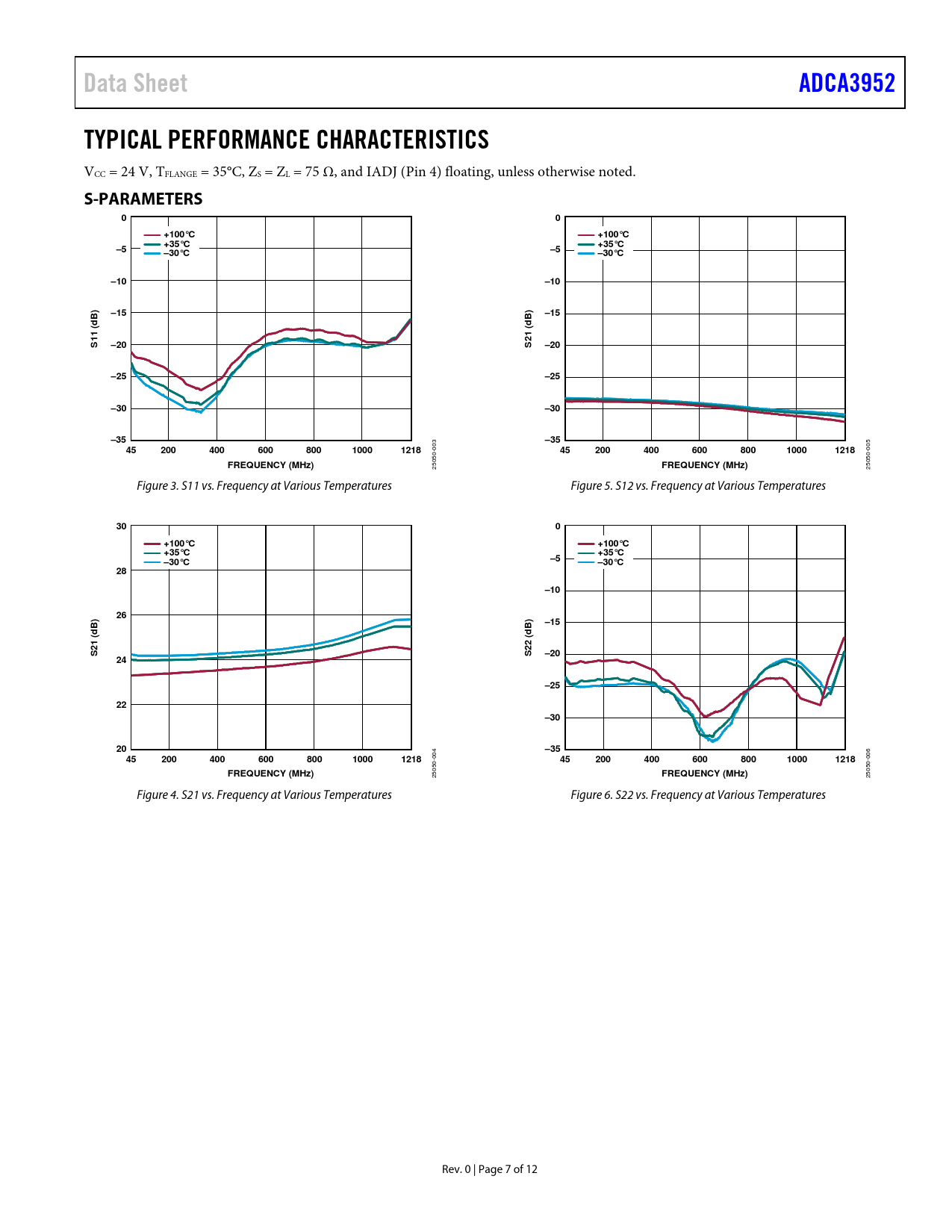 Data Sheet ADCA3952 TYPICAL PERFORMANCE CHARACTERISTICS S-PARAMETERS +100°C +35°C –30°C –10 –15 11 ( 21 ( –20 –25 –30 –35 200 400 600 800