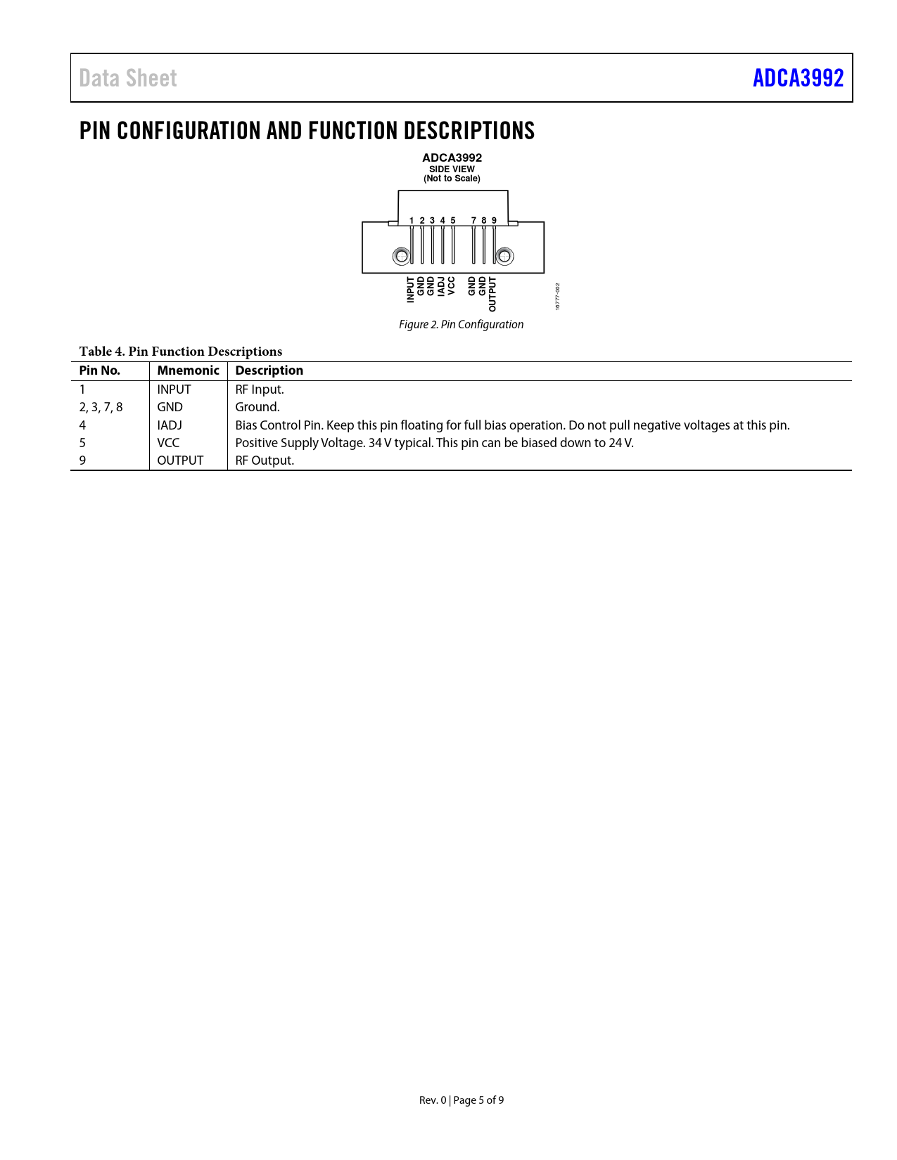 Data SheetADCA3992PIN CONFIGURATION AND FUNCTION DESCRIPTIONSADCA3992SIDE VIEW(Not to Scale)1 2 3 4 57 8 9UTNDNDCCNDNDUTGIADJGVPGG 002 INPUT O 16777- Figure 2. Pin Configuration Table 4. Pin Function Descriptions Pin No.Mnemonic Description 1 INPUT RF Input. 2, 3, 7, 8 GND Ground. 4 IADJ Bias Control Pin. Keep this pin floating for full bias operation. Do not pull negative voltages at this pin. 5 VCC Positive Supply Voltage. 34 V typical. This pin can be biased down to 24 V. 9 OUTPUT RF Output. Rev. 0 | Page 5 of 9 Document Outline FEATURES APPLICATIONS FUNCTIONAL BLOCK DIAGRAM GENERAL DESCRIPTION TABLE OF CONTENTS REVISION HISTORY SPECIFICATIONS GENERAL PERFORMANCE DISTORTION DATA, 40 MHz TO 550 MHz ABSOLUTE MAXIMUM RATINGS ESD CAUTION PIN CONFIGURATION AND FUNCTION DESCRIPTIONS TYPICAL PERFORMANCE CHARACTERISTICS THEORY OF OPERATION APPLICATIONS INFORMATION OUTLINE DIMENSIONS ORDERING GUIDE