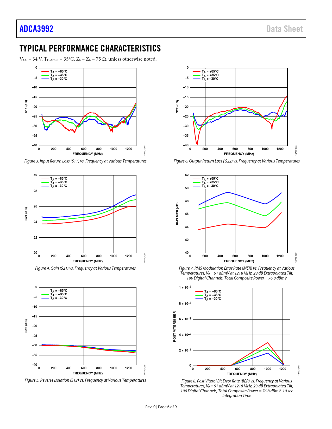 16777- Figure 4. Gain (S21) vs. Frequency at Various Temperatures Figure 7. RMS Modulation Error Rate (MER) vs. Frequency at Various Temperatures, V0 = 61 dBmV at 1218 MHz, 23 dB Extrapolated Tilt, 190 Digital Channels, Total Composite Power = 76.8 dBmV