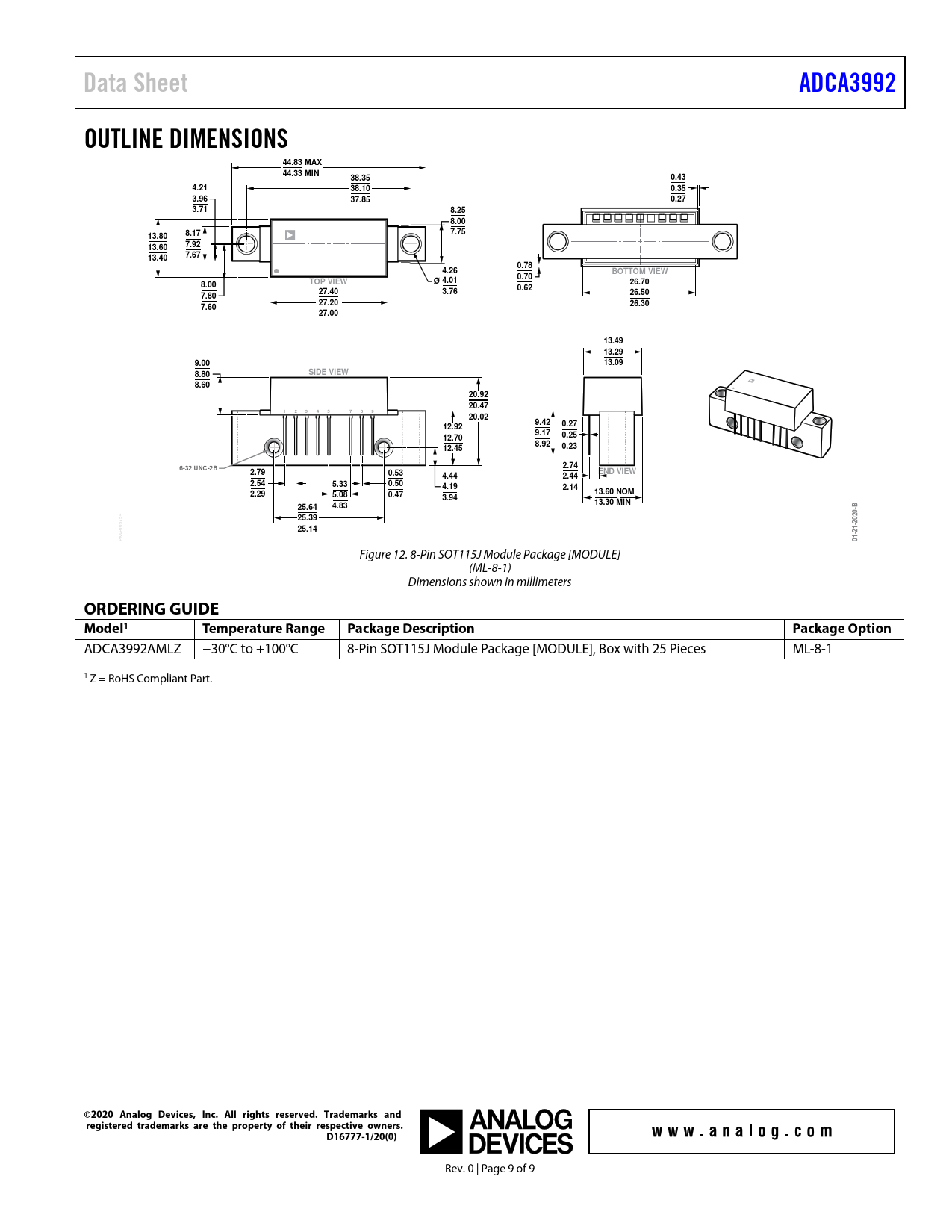 Data Sheet ADCA3992 OUTLINE DIMENSIONS 44.83 MAX 44.33 MIN 38.35 0.43 4.21 38.10 0.35 3.96 37.85 0.27 3.71 8.25 8.00 8.17 7.75 13.80 13.60 7.92 13.40 7.67 0.78 4.26 BOTTOM VIEW 0.70 TOP VIEW Ø 4.01 8.00 26.70 0.62 27.40 3.76 7.80 26.50 27.20 7.60 26.30 27.00 13.49 13.29 9.00 13.09 SIDE VIEW 8.80 8.60 20.92 20.47 1 2 3 4 5 7 8 9 20.02 9.42 0.27 12.92 9.17 0.25 12.70 8.92 0.23 12.45 2.74 6-32 UNC-2B 2.79 0.53 END VIEW 4.44 2.44 2.54 5.33 0.50 4.19 2.14 2.29 5.08 0.47 13.60 NOM 3.94 13.30 MIN B 25.64 4.83 25.39 2020- -005754 25.14 21- G K P 01-