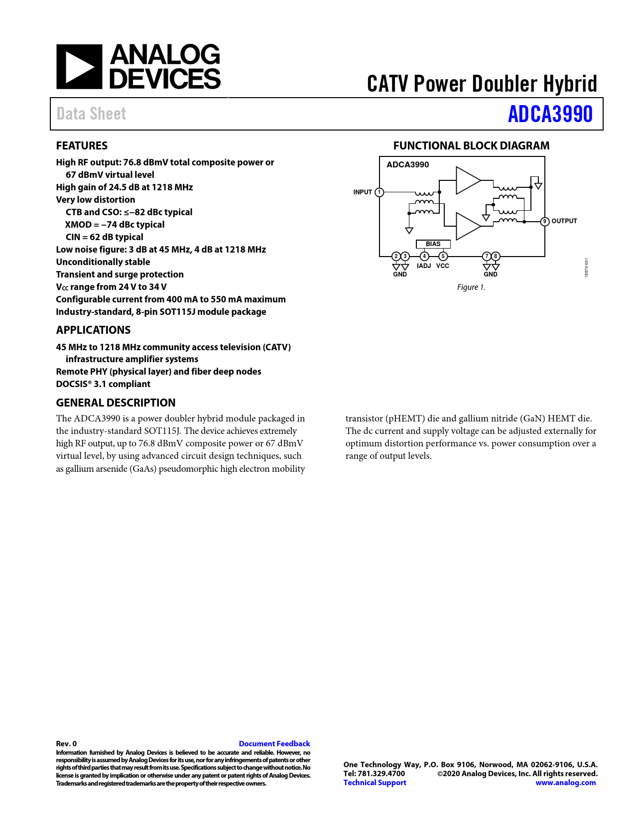 Configurable current from 400 mA to 550 mA maximum Industry-standard, 8-pin SOT115J module package APPLICATIONS 45 MHz to 1218 MHz community access television (CATV) infrastructure amplifier systems Remote PHY (physical layer) and fiber deep nodes DOCSIS® 3.1 compliant GENERAL DESCRIPTION