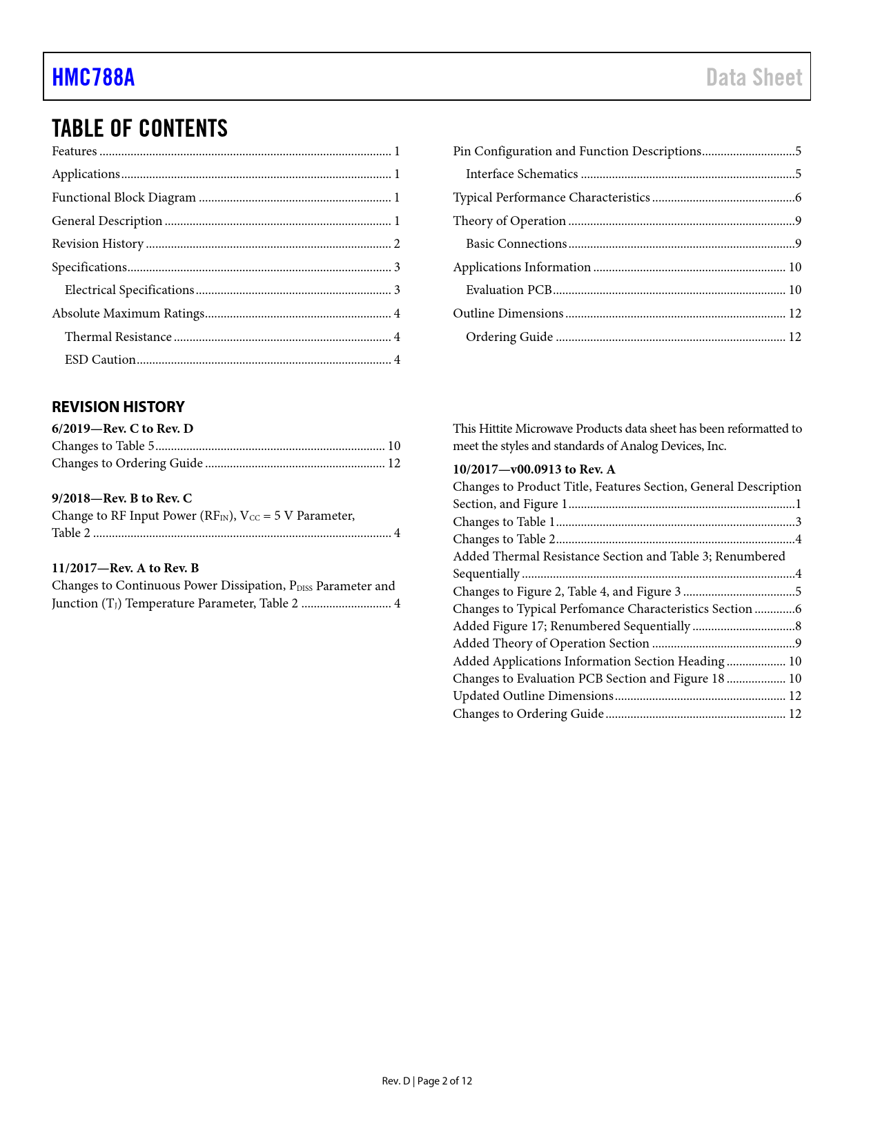 link to page 1 link to page 1 link to page 1 link to page 1 link to page 2 link to page 3 link to page 3 link to page 4 link to page 4 link to page 4 link to page 5 link to page 5 link to page 6 link to page 9 link to page 9 link to page 10 link to page 10 link to page 12 link to page 12 HMC788AData SheetTABLE OF CONTENTS Features .. 1 Pin Configuration and Function Descriptions ..5 Applications ... 1 Interface Schematics ...5 Functional Block Diagram .. 1 Typical Performance Characteristics ..6 General Description ... 1 Theory of Operation ...9 Revision History ... 2 Basic Connections ...9 Specifications ... 3 Applications Information .. 10 Electrical Specifications ... 3 Evaluation PCB ... 10 Absolute Maximum Ratings .. 4 Outline Dimensions ... 12 Thermal Resistance .. 4 Ordering Guide .. 12 ESD Caution .. 4 REVISION HISTORY 6/2019—Rev. C to Rev. D This Hittite Microwave Products data sheet has been reformatted to Changes to Table 5 .. 10 meet the styles and standards of Analog Devices, Inc. Changes to Ordering Guide .. 12 10/2017—v00.0913 to Rev. A Changes to Product Title, Features Section, General Description 9/2018—Rev. B to Rev. C Section, and Figure 1 ... 1 Change to RF Input Power (RFIN), VCC = 5 V Parameter, Changes to Table 1 ... 3 Table 2 .. 4 Changes to Table 2 ... 4 Added Thermal Resistance Section and Table 3; Renumbered 11/2017—Rev. A to Rev. B Sequentially .. 4 Changes to Continuous Power Dissipation, PDISS Parameter and Changes to Figure 2, Table 4, and Figure 3 .. 5 Junction (TJ) Temperature Parameter, Table 2 ... 4 Changes to Typical Perfomance Characteristics Section ... 6 Added Figure 17; Renumbered Sequentially ... 8 Added Theory of Operation Section .. 9 Added Applications Information Section Heading ... 10 Changes to Evaluation PCB Section and Figure 18 ... 10 Updated Outline Dimensions ... 12 Changes to Ordering Guide .. 12 Rev. D | Page 2 of 12 Document Outline FEATURES APPLICATIONS FUNCTIONAL BLOCK DIAGRAM GENERAL DESCRIPTION REVISION HISTORY SPECIFICATIONS ELECTRICAL SPECIFICATIONS ABSOLUTE MAXIMUM RATINGS THERMAL RESISTANCE ESD CAUTION PIN CONFIGURATION AND FUNCTION DESCRIPTIONS INTERFACE SCHEMATICS TYPICAL PERFORMANCE CHARACTERISTICS THEORY OF OPERATION BASIC CONNECTIONS APPLICATIONS INFORMATION EVALUATION PCB OUTLINE DIMENSIONS ORDERING GUIDE