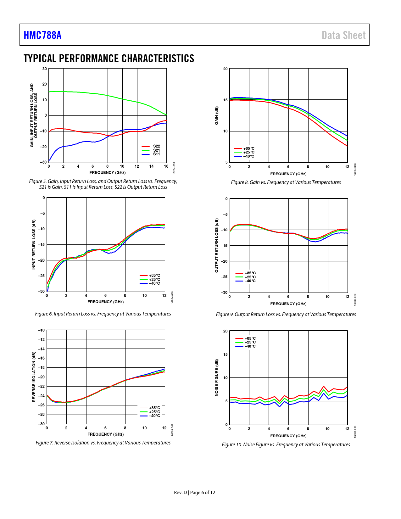 HMC788A. Data Sheet. TYPICAL PERFORMANCE CHARACTERISTICS. , AND S. S O. URN L. N (. AI G. UT P –10. UT O. N, AI G. –20. S22. +85°C. S21. +25°C. S11