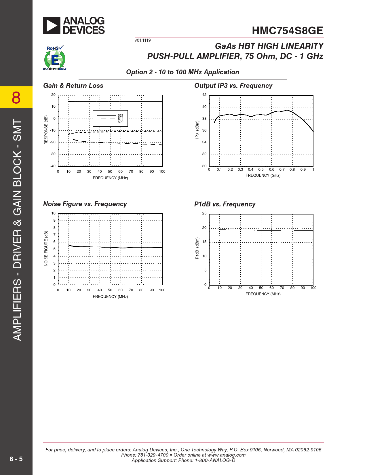 HMC754S8GE. GaAs HBT HIGH LINEARITY. PUSH-PULL AMPLIFIER, 75 Ohm, DC - 1 GHz. Option 2 - 10 to 100 MHz Application