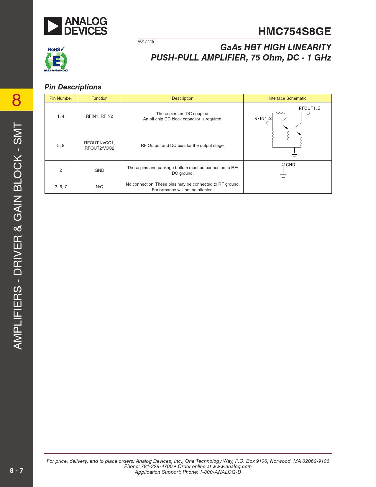 HMC754S8GE v01.1119 GaAs HBT HIGH LINEARITYPUSH-PULL AMPLIFIER, 75 Ohm, DC - 1 GHzPin Descriptions 8 Pin Number Function Description Interface Schematic These pins are DC coupled. 1, 4 RFIN1, RFIN2 T An off chip DC block capacitor is required. M RFOUT1/VCC1, 5, 8 RF Output and DC bias for the output stage. RFOUT2/VCC2 K - S C These pins and package bottom must be connected to RF/ 2 GND DC ground. LO No connection. These pins may be connected to RF ground. 3, 6, 7 N/C Performance will not be affected. IN B A R & G E IV R S - D R IE LIF P M A For price, delivery, and to place orders: Analog Devices, Inc., One Technology Way, P.O. Box 9106, Norwood, MA 02062-9106 8 - 7 Phone: 781-329-4700 • Order online at www.analog.com Application Support: Phone: 1-800-ANALOG-D Document Outline Typical Applications Features Functional Diagram General Description Electrical Specifications Typical Performance Characteristics Gain & Return Loss Gain vs. Temperature Input Return Loss vs. Temperature Output Return Loss vs. Temperature Output IP3 vs. Temperature Output IP2 vs. Temperature Noise Figure vs. Temperature P1dB vs. Temperature Reverse Isolation vs. Temperature Output IP2 vs. Output Power CSO / CTB / XMOD @ +15 dBmV input, 133 channels (Analog) Option 1 - Improved Input Return Loss & Gain Flatness (with Lower IP2) Application Gain & Return Loss Output IP2 vs. Frequency Output IP3 vs. Frequency Noise Figure vs. Frequency P1dB vs. Frequency Option 2 - 10 to 100 MHz Application Gain & Return Loss Output IP3 vs. Frequency Noise Figure vs. Frequency P1dB vs. Frequency Absolute Maximum Ratings Outline Drawing Package Information Pin Descriptions Application Circuit for Push-Pull Operation Components for Selected Options Evaluation PCB Option 2 Application List of Materials Option 1 Application List of Materials