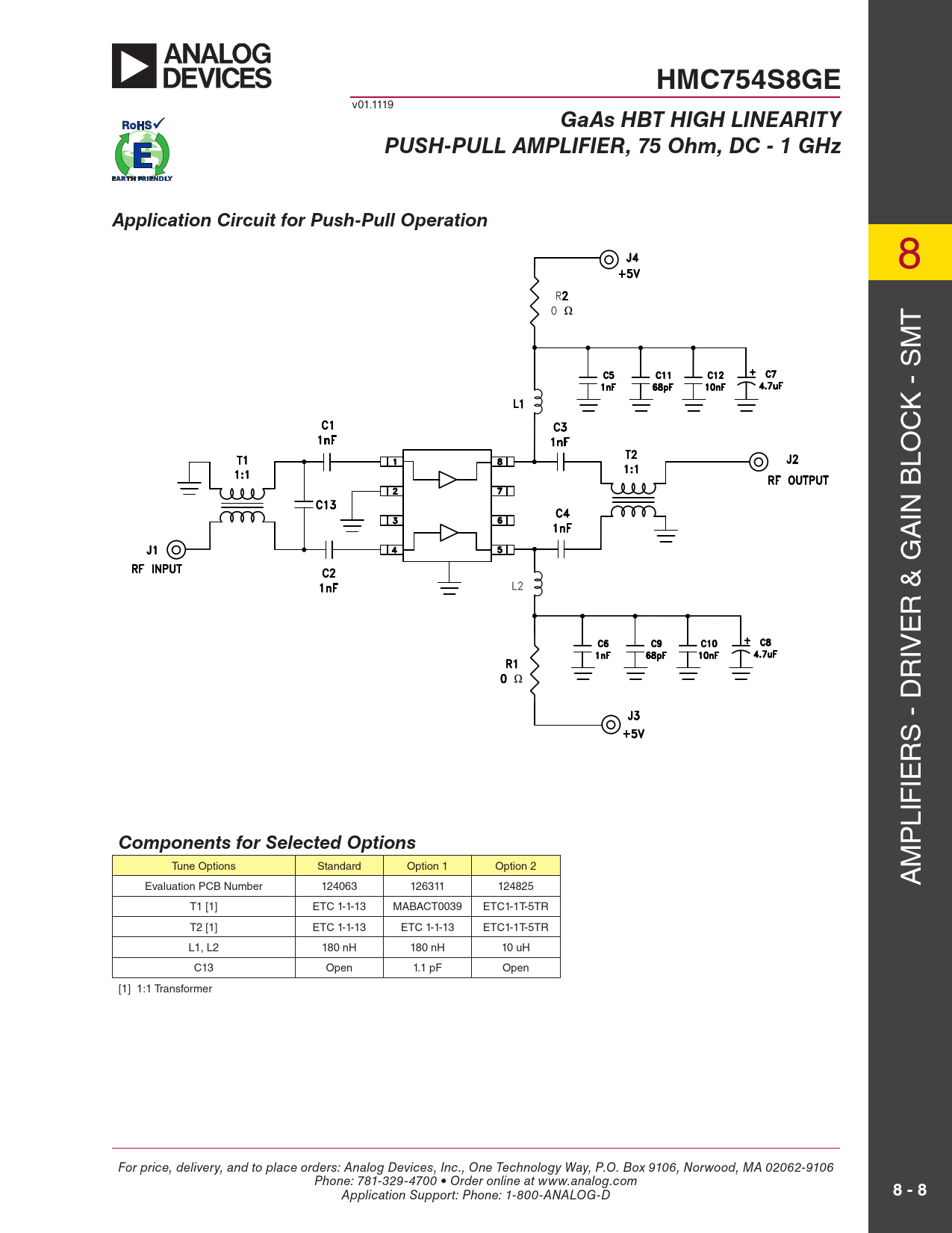 HMC754S8GE. GaAs HBT HIGH LINEARITY. PUSH-PULL AMPLIFIER, 75 Ohm, DC - 1 GHz. Application Circuit for Push-Pull Operation