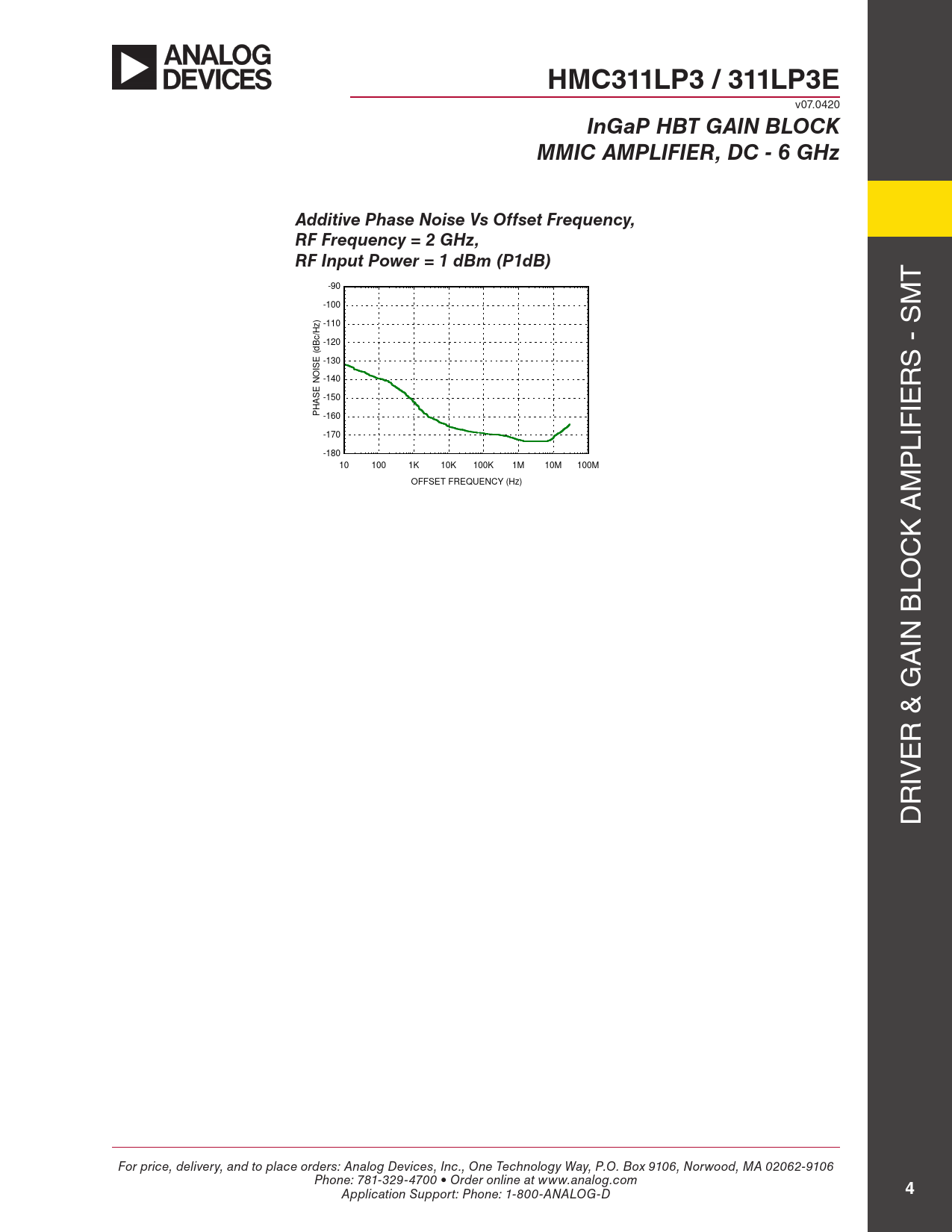 HMC311LP3 / 311LP3E v07.0420 InGaP HBT GAIN BLOCKMMIC AMPLIFIER, DC - 6 GHzAdditive Phase Noise Vs Offset Frequency, RF Frequency = 2 GHz, RF Input Power = 1 dBm (P1dB) T -90 -100 M ) z -110 /H Bc -120 (d -130 ISE S - S O N -140 R -150 ASE PH IE -160 -170 -180 LIF 10 100 1K 10K 100K 1M 10M 100M P OFFSET FREQUENCY (Hz) M K A C LO IN B A R & G E IV R D For price, delivery, and to place orders: Analog Devices, Inc., One Technology Way, P.O. Box 9106, Norwood, MA 02062-9106 Phone: 781-329-4700 • Order online at www.analog.com Application Support: Phone: 1-800-ANALOG-D 4