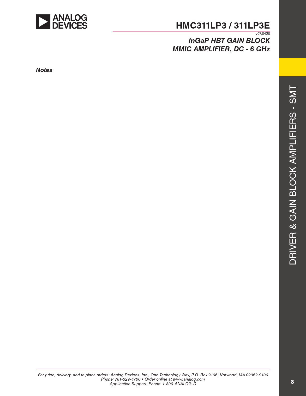 HMC311LP3 / 311LP3E. InGaP HBT GAIN BLOCK. MMIC AMPLIFIER, DC - 6 GHz. Notes