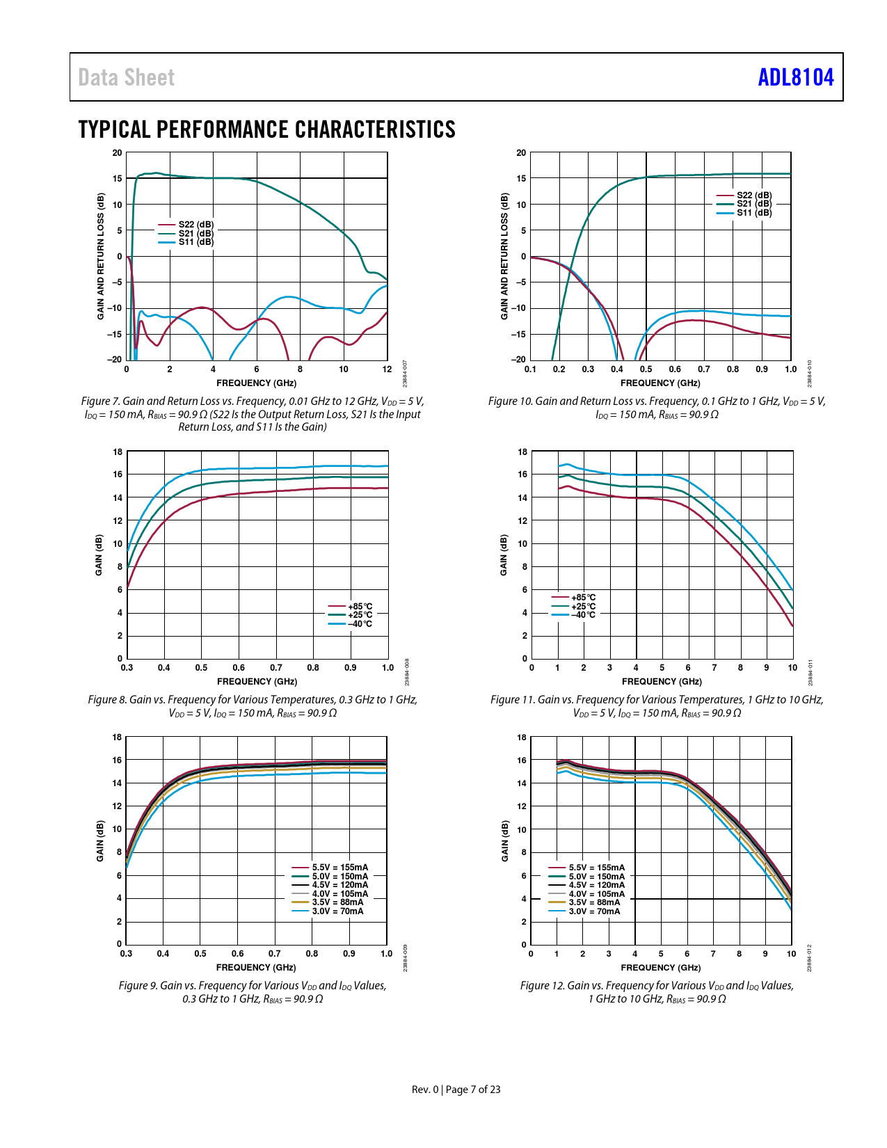 Páginas / Página23 / 7 — Data Sheet. ADL8104. TYPICAL PERFORMANCE CHARACTERISTICS. S22 (dB). S21 …